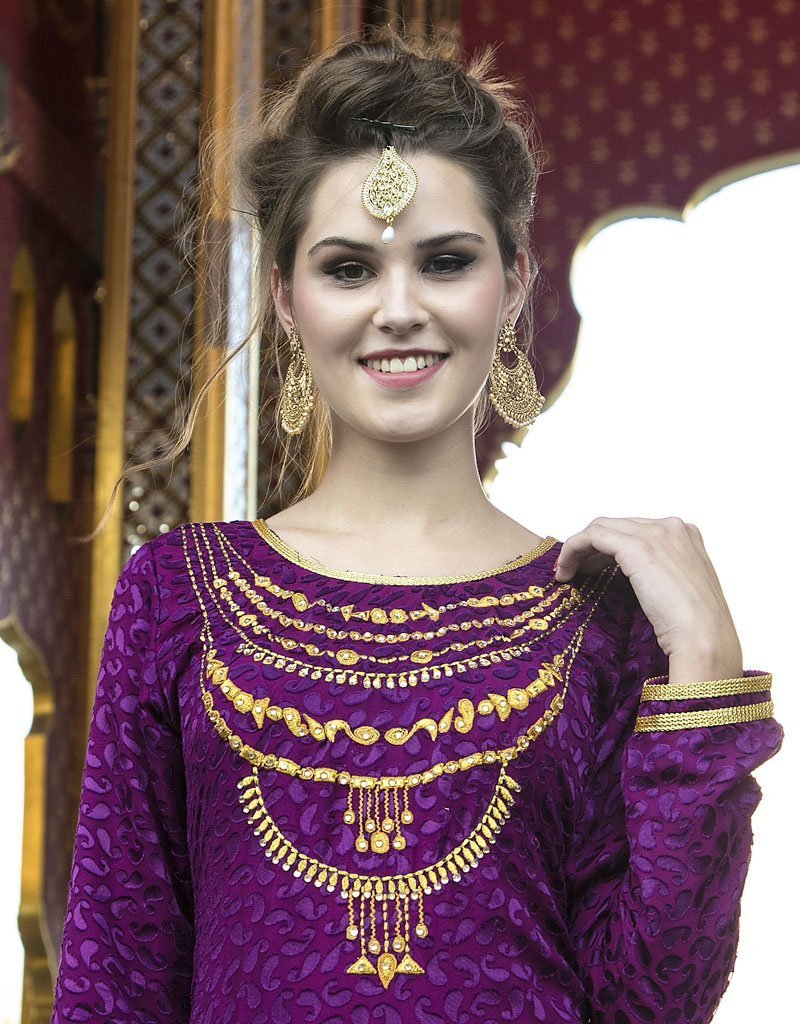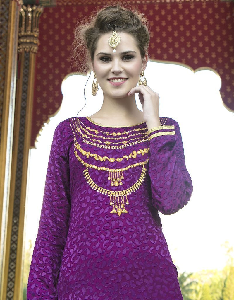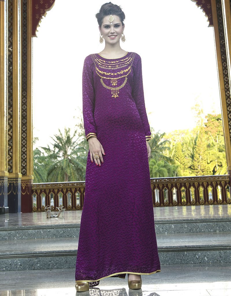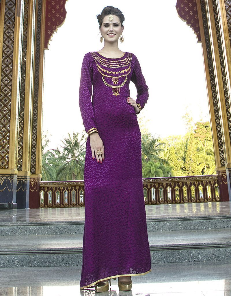 - A-line Evening Party Dresses Kaftan Purple Color in Brasso Printed Fabric with Golden Color Establishment