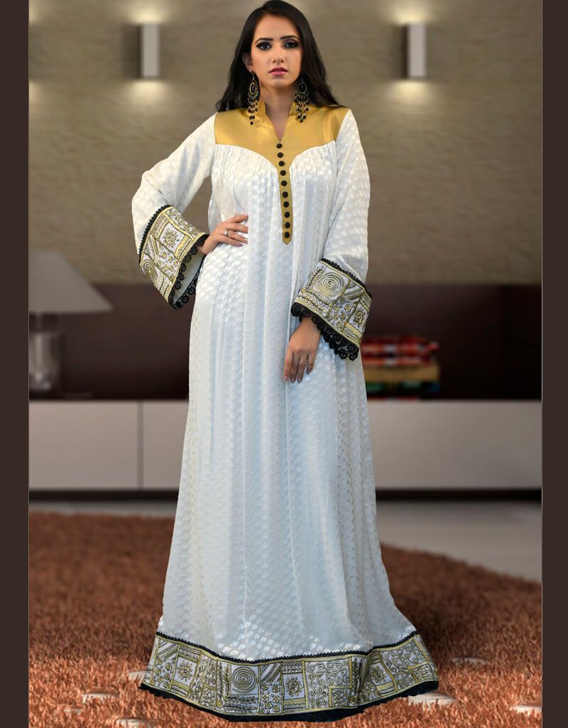 - A-line Partywear Abaya Kaftan White Color in Brasso Printed Fabric with Golden Color Establishment
