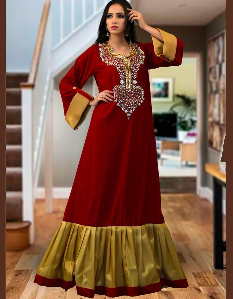 - A-line Style Kaftan Maroon Color in Velvet Printed Fabric with Silver Color Establishment