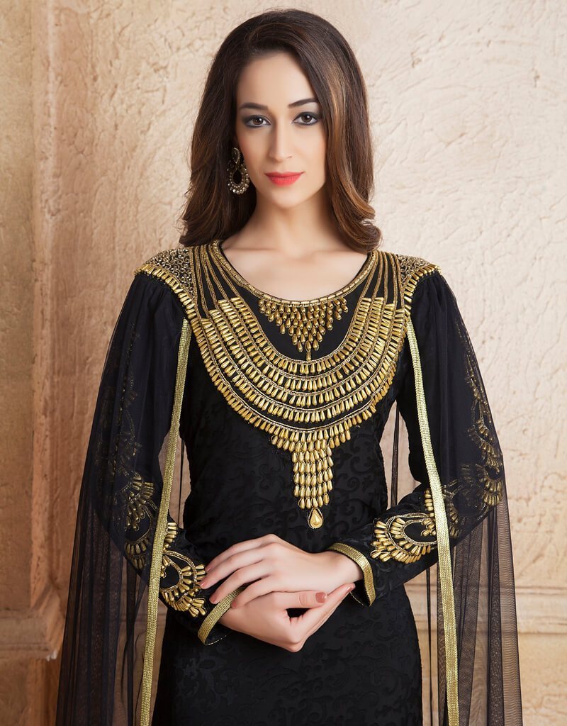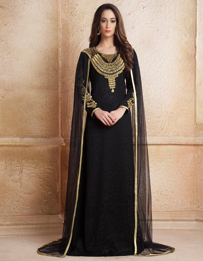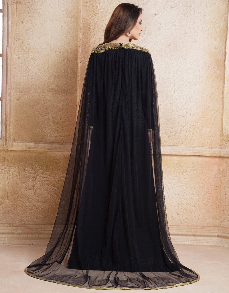 - Arab Dubai Style kaftan With Trail Black Color in Net Printed Fabric with Golden Color Work