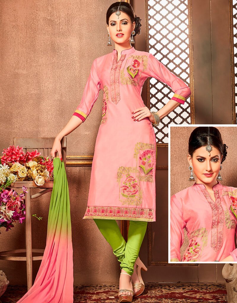 Office Wear Straight Baby Pink Colored Glazz Cotton Top With Parrot Green Colored Semi Loan Bottom.