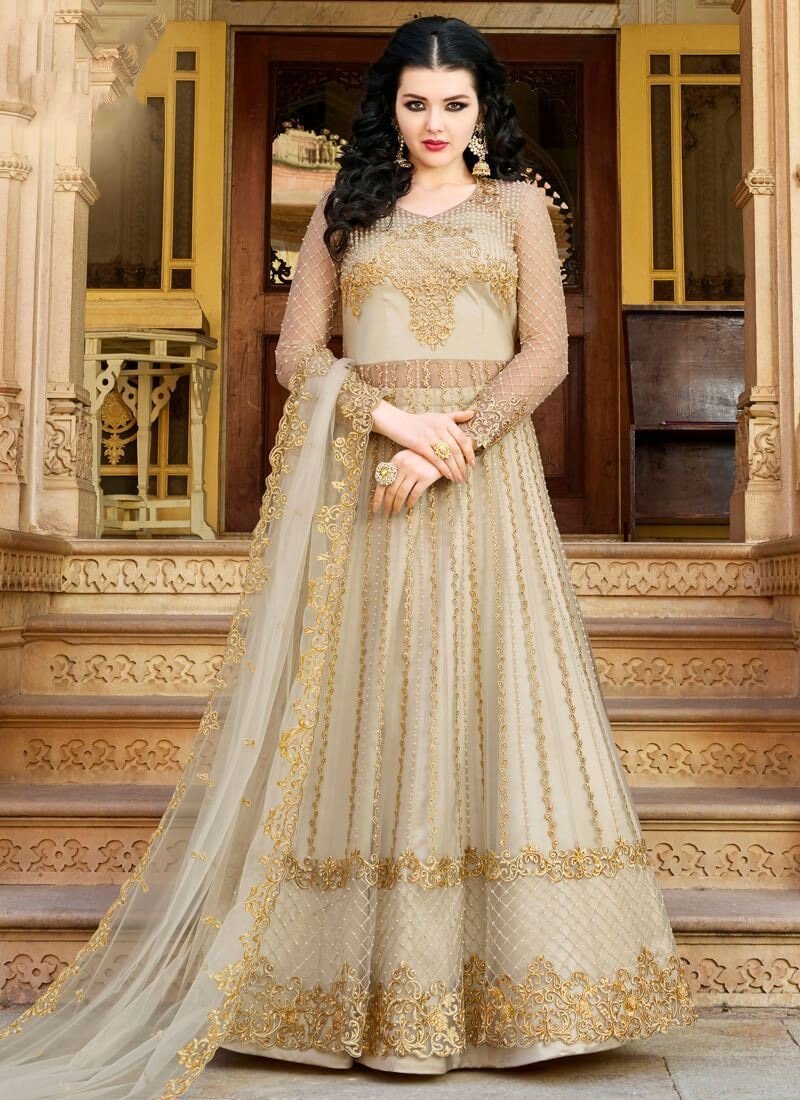 Arabic Muslim Beige colored Salwar Kameez in Anarkali Style made with Net top and Heavy Satin Bottom fabric