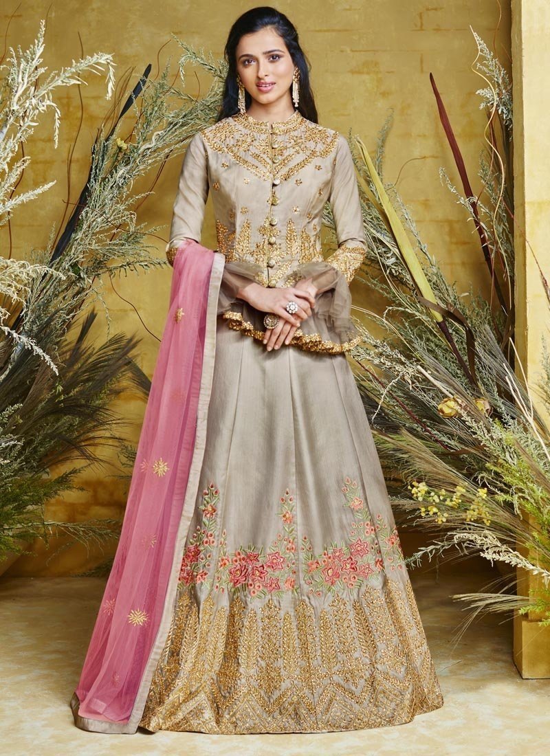 Beige Heavy Net With Pure Silk Lehenga Anarkali