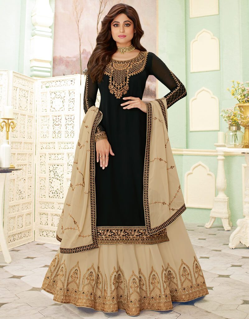 Partywear Black colored Salwar Kameez in Lehenga Style made with Real Georgette top and Real Georgette Bottom fabric