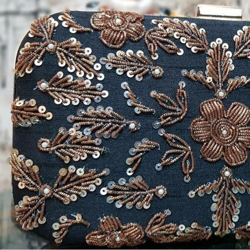 Black Rectangle Embroidered Synthetic Clutches