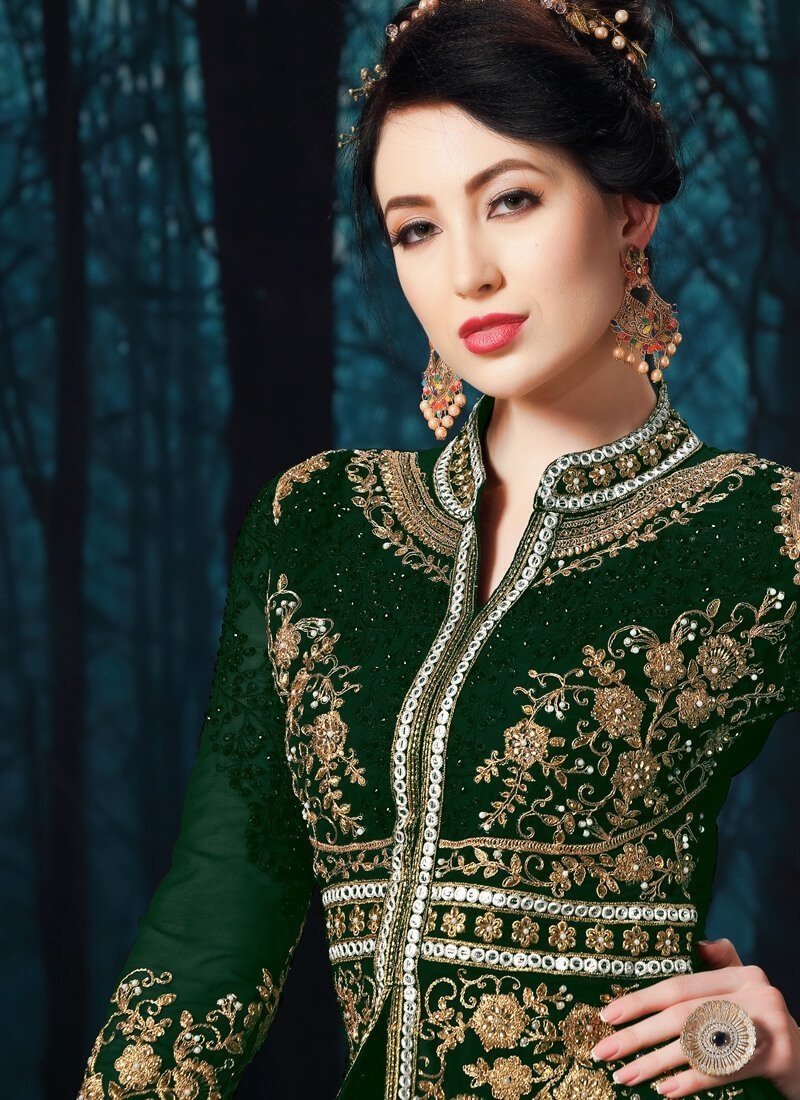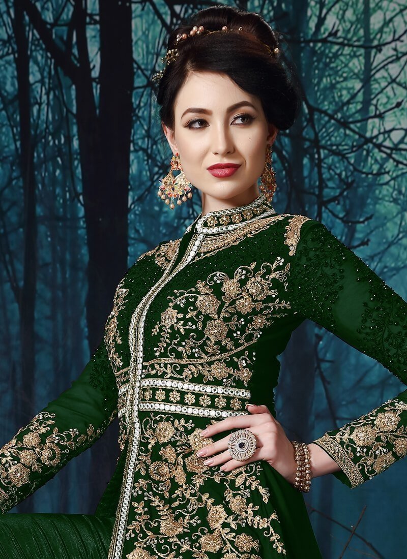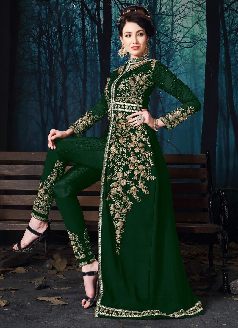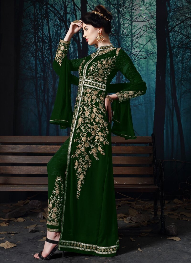 Exclusive designer Bottle Green colored Salwar Kameez in Pant Style made with Pure Chiffon top and Pure Santoon Bottom fabric