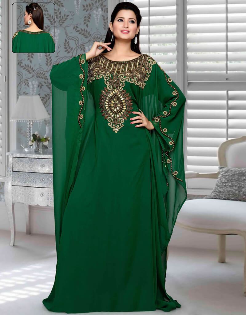 - Dark green colored farasha jalabiya dress for islamic women with copper embroidery on sleeve