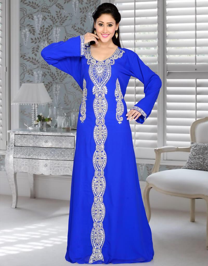 - Blue kaftan with round neckline,silver embroidery and Full sleeves.Bright silver work with stone in full kaftan.