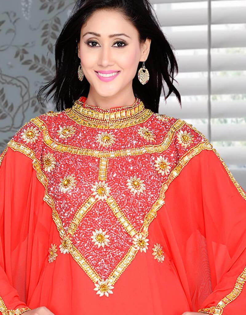- This Delightful Diva Accoutre Features Unique Styling And Unusual Material Be The Center Of Attraction With This Vivacious Red Embroidered Islamic Kaftans.This Attire Is Lovely Designed With Embroidery & Hand Beaded Work.