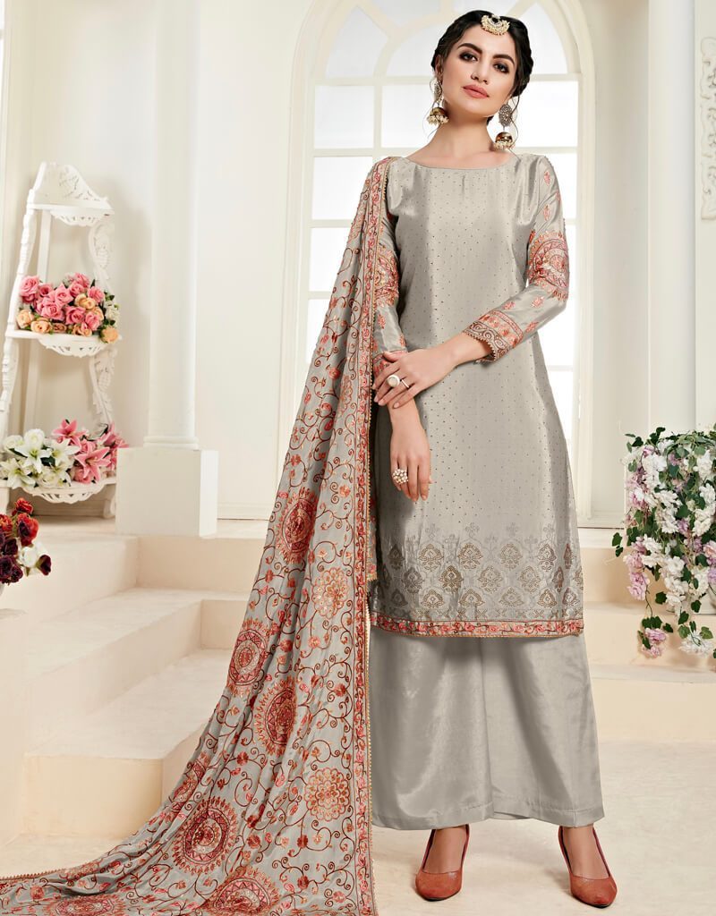 Women Salwar Suit with Heavy Zari and Thread Embroidery and Swarovski Work Grey color