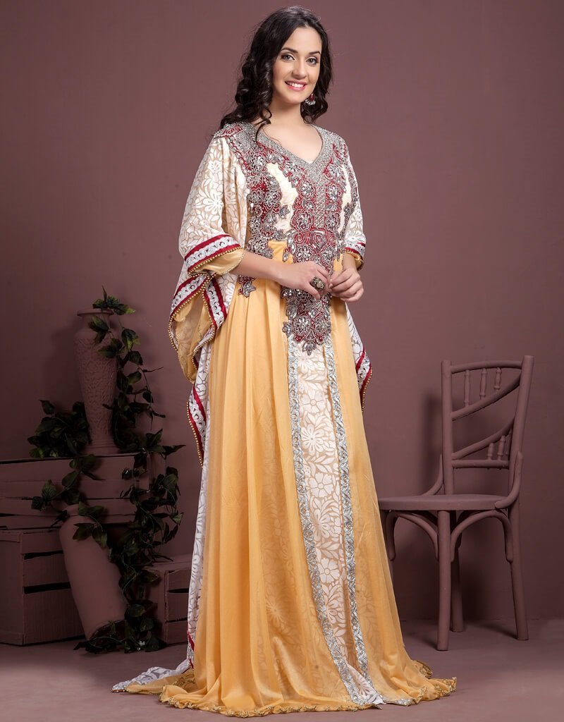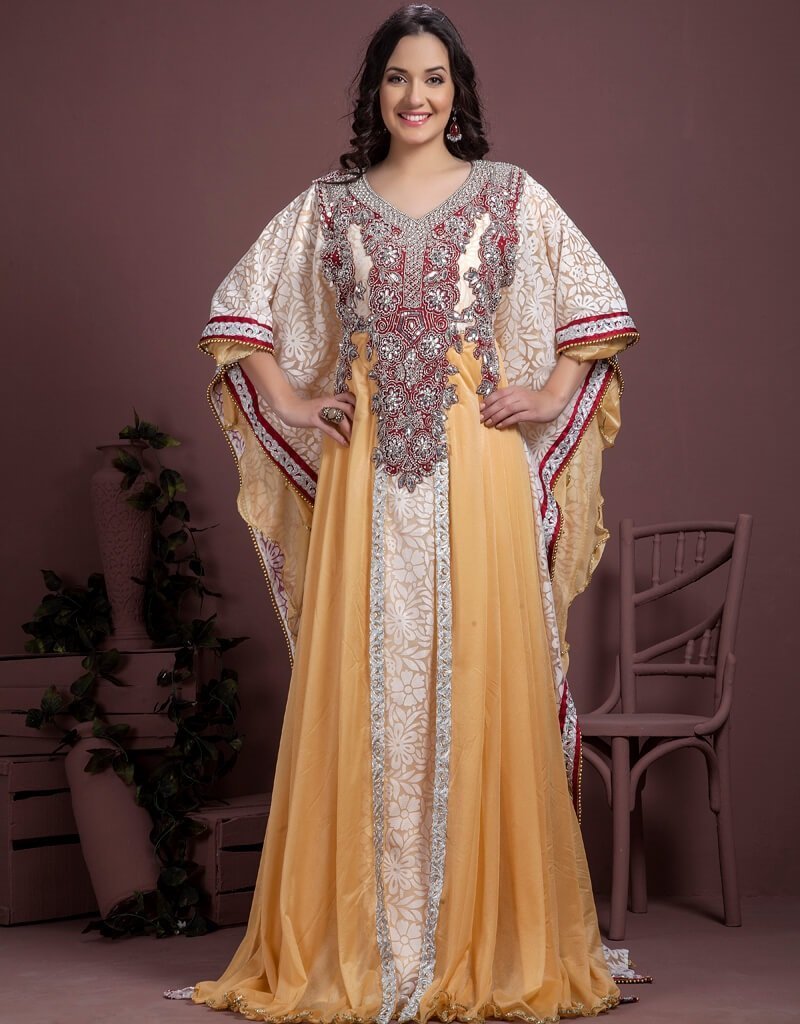 - Contemporary Classy Off White, Maroon Modern Party Dress Kaftan With Long Work In Neck
