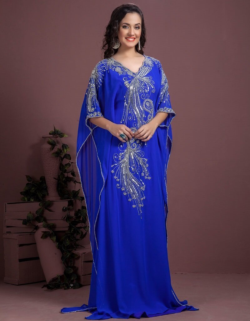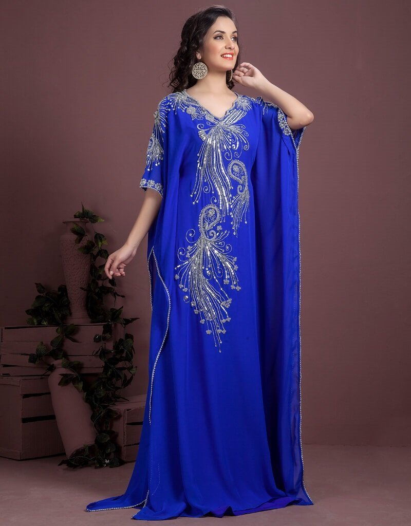 - Beautiful Blue Embroidered Georgette and Crepe Farasha Caftan With Silver Work