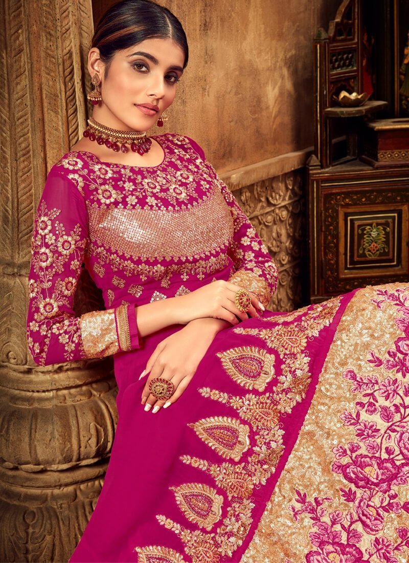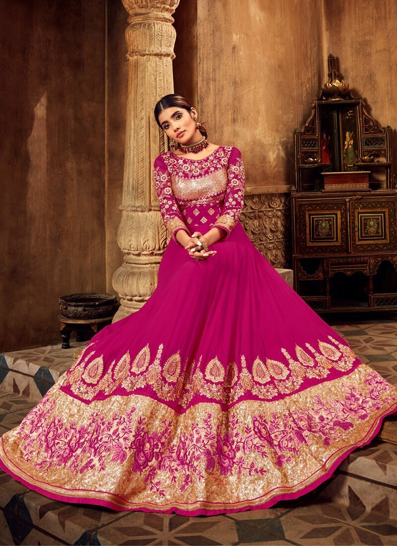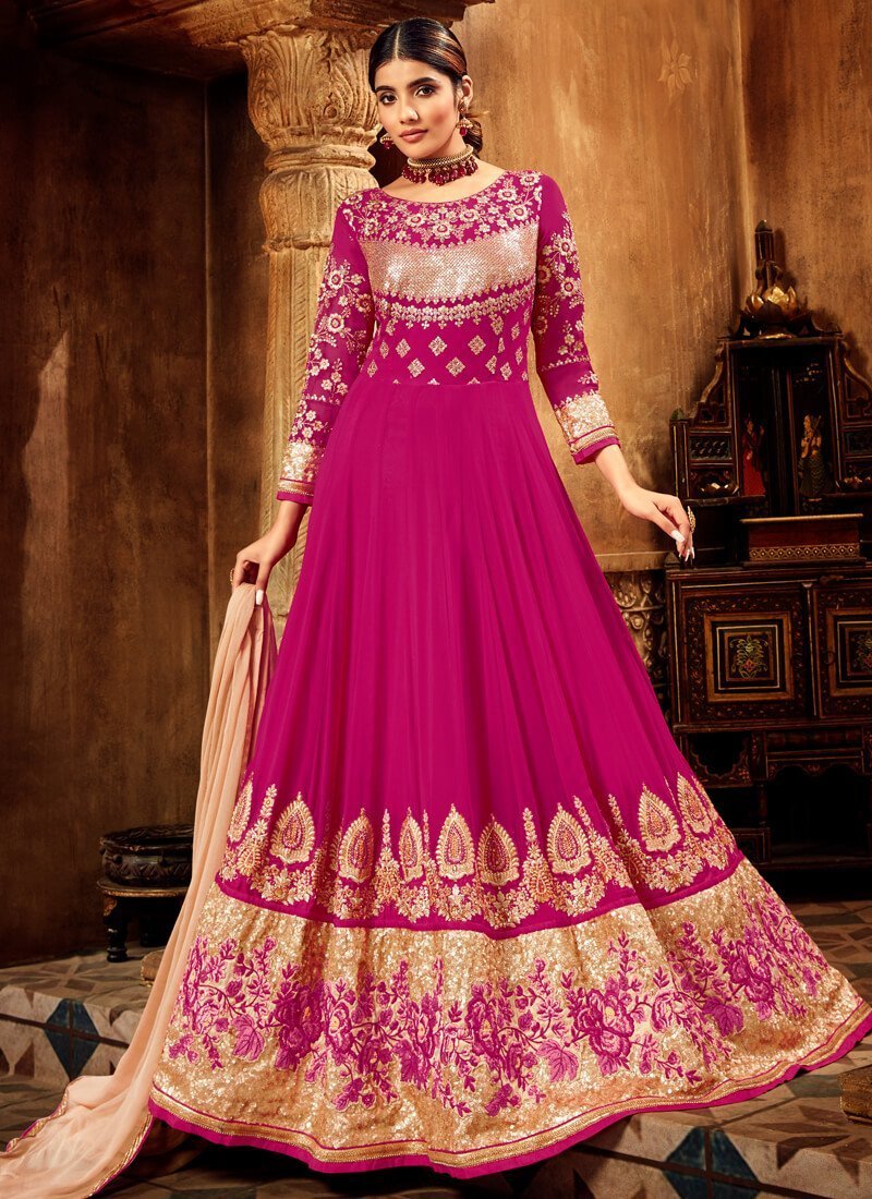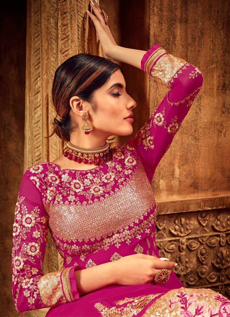 Lehenga Palazzo Dark Pink colored Salwar Kameez in Anarkali Style made with Chiffon top and Pure Georgette + Velvet Bottom fabric