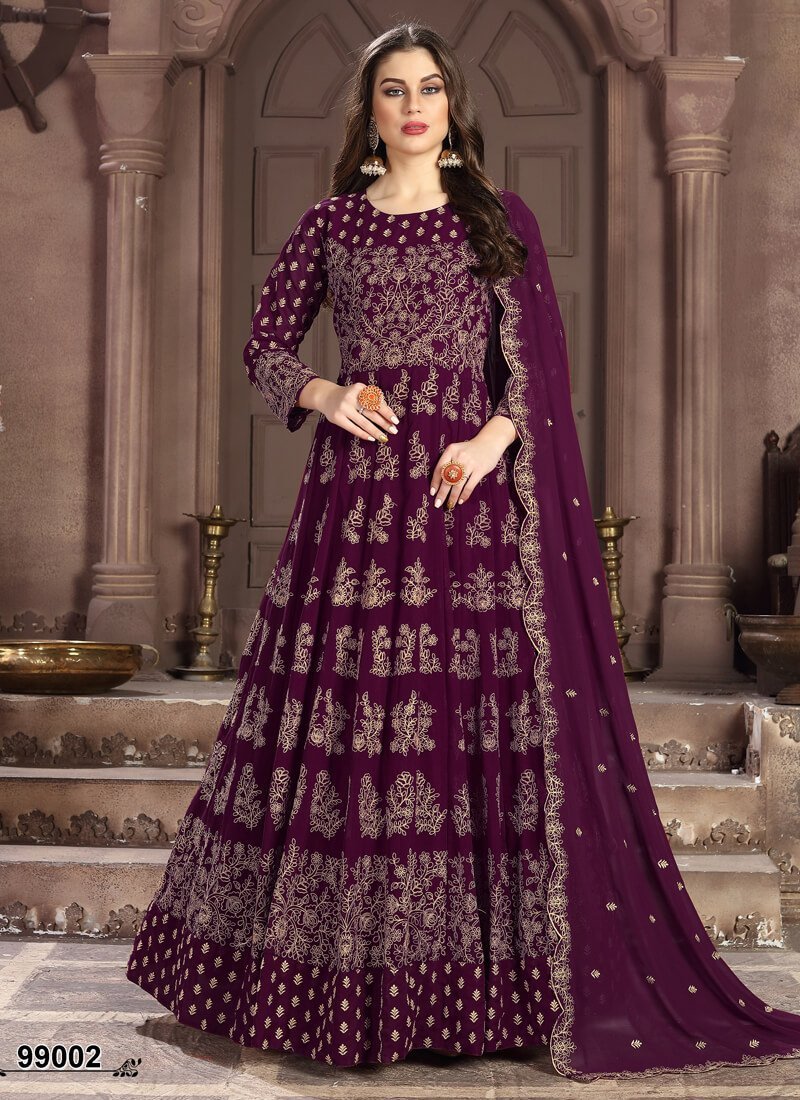 Dark Purple Anarkali style Straight Semi-Stitched Salwar Kameez