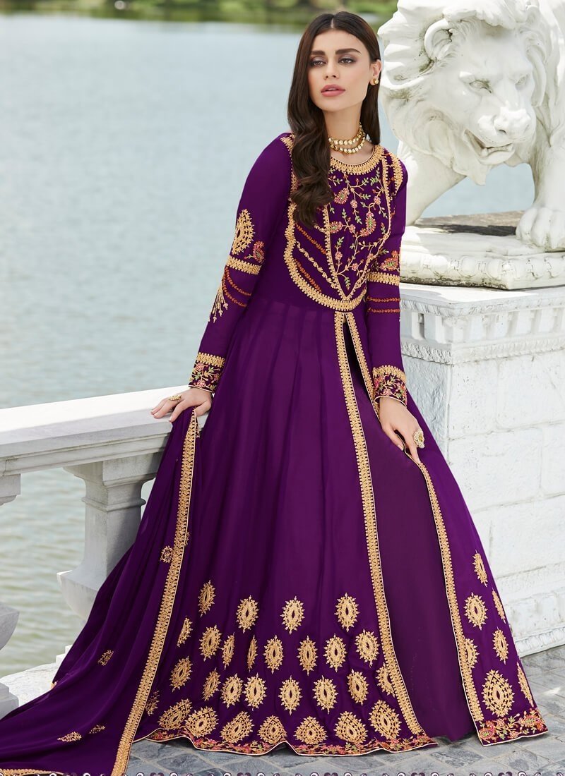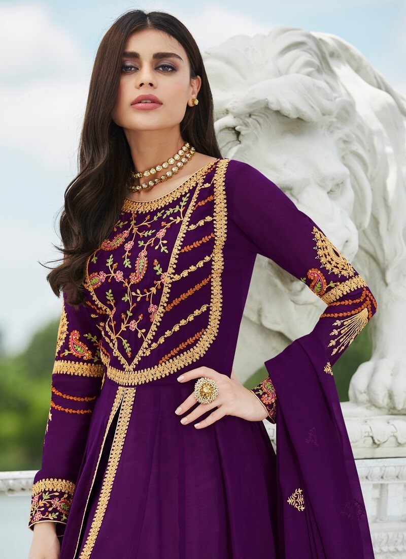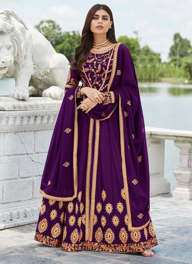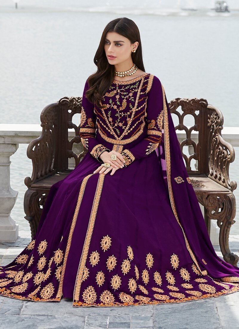 Arabic Muslim Dark Purple colored Salwar Kameez in Anarkali Style made with Real Georgette top and Real Georgette Bottom fabric