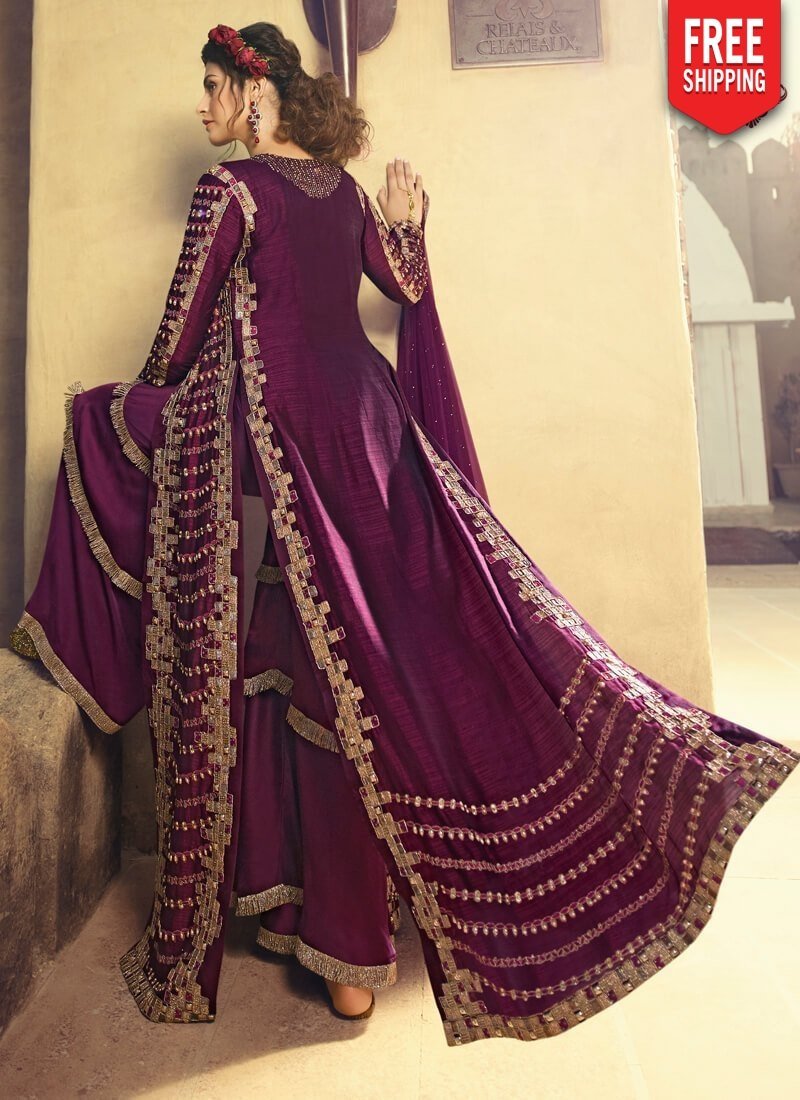 Arabic Muslim Dark Purple colored Salwar Kameez in Anarkali Style made with Net top and Satin Bottom fabric