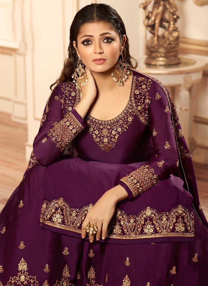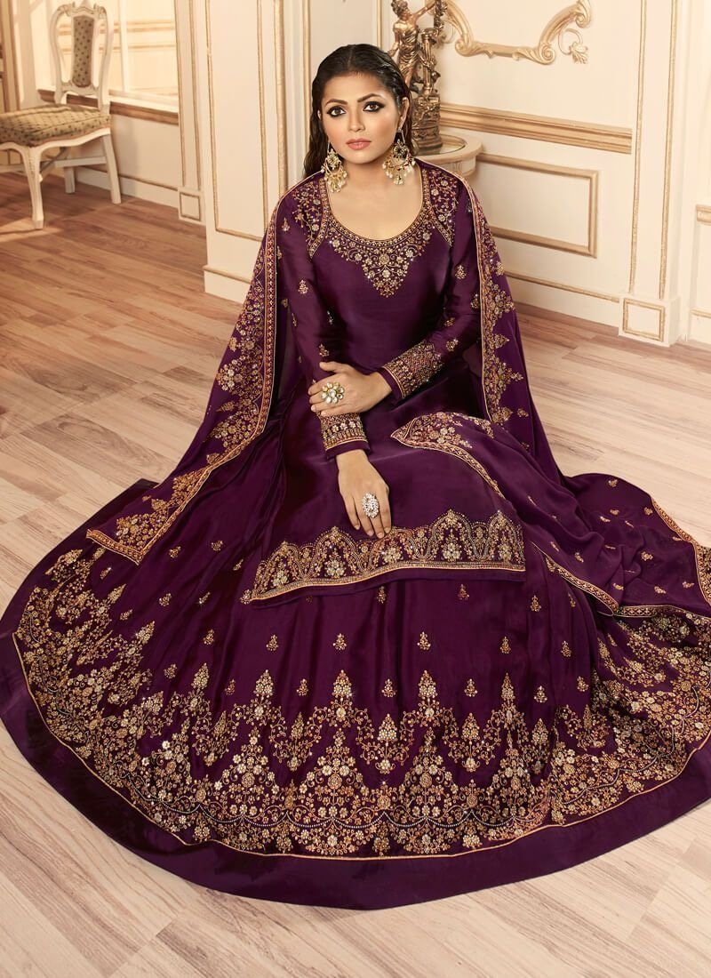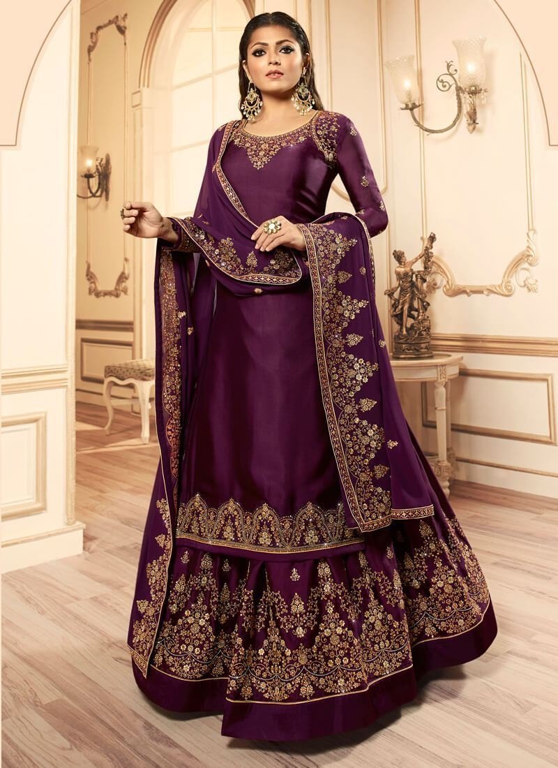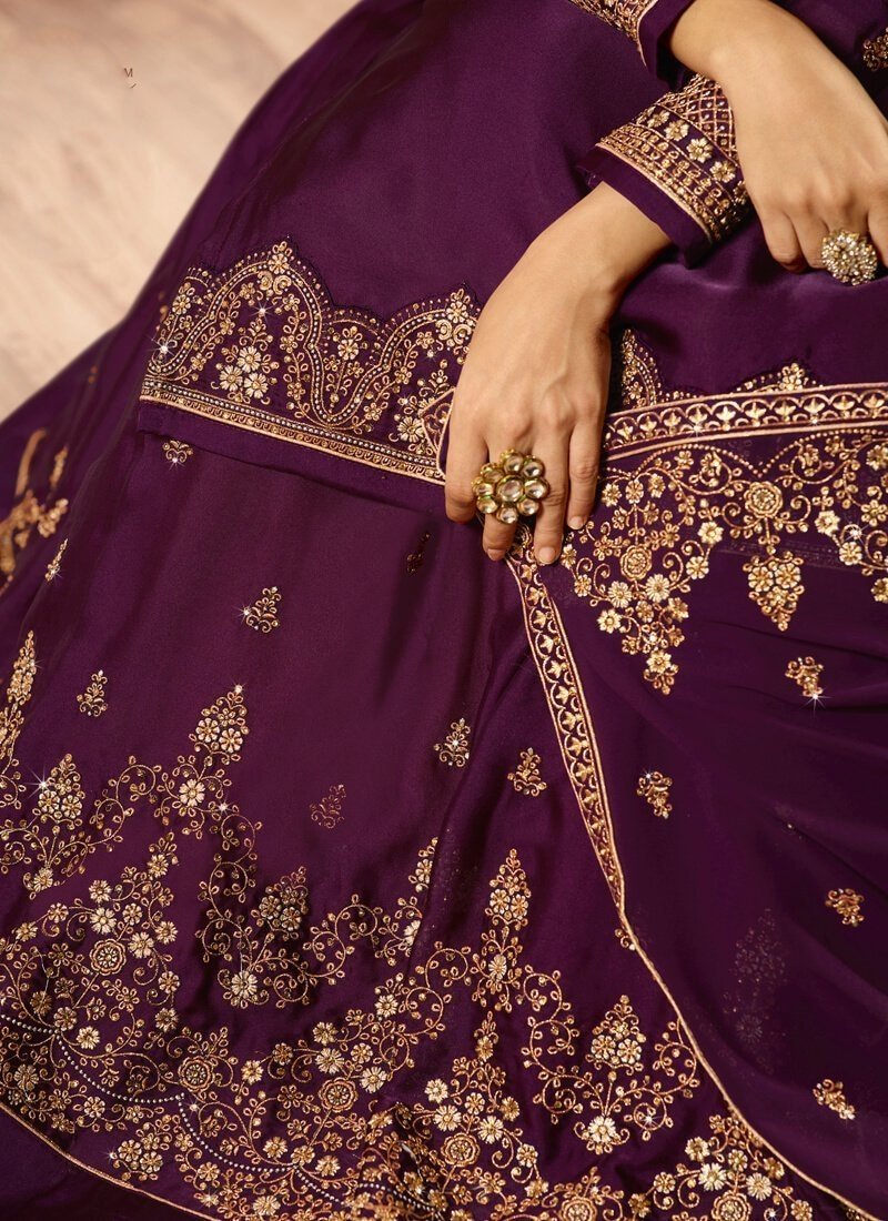 Dark Purple Lehenga style Salwar Kameez Georgette Satin
