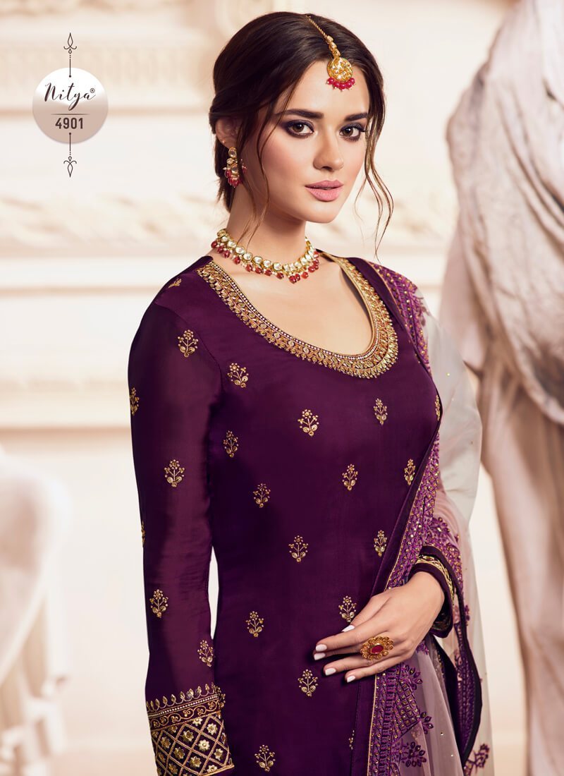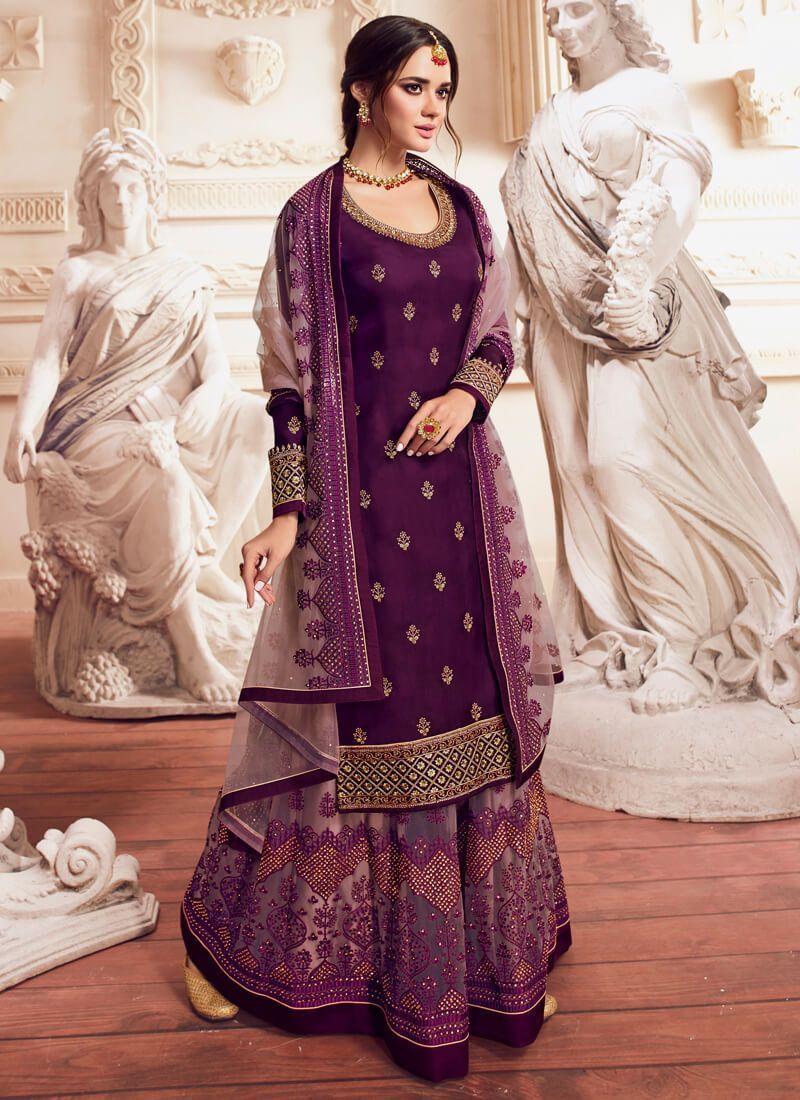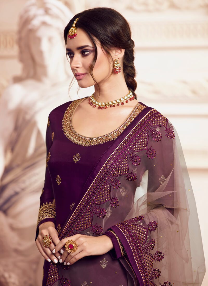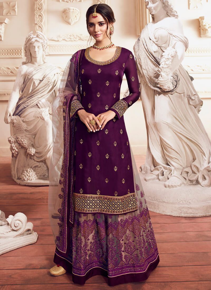 Partywear Dark Purple colored Salwar Kameez in Palazzo Style made with Net top and Satin Georgette Bottom fabric