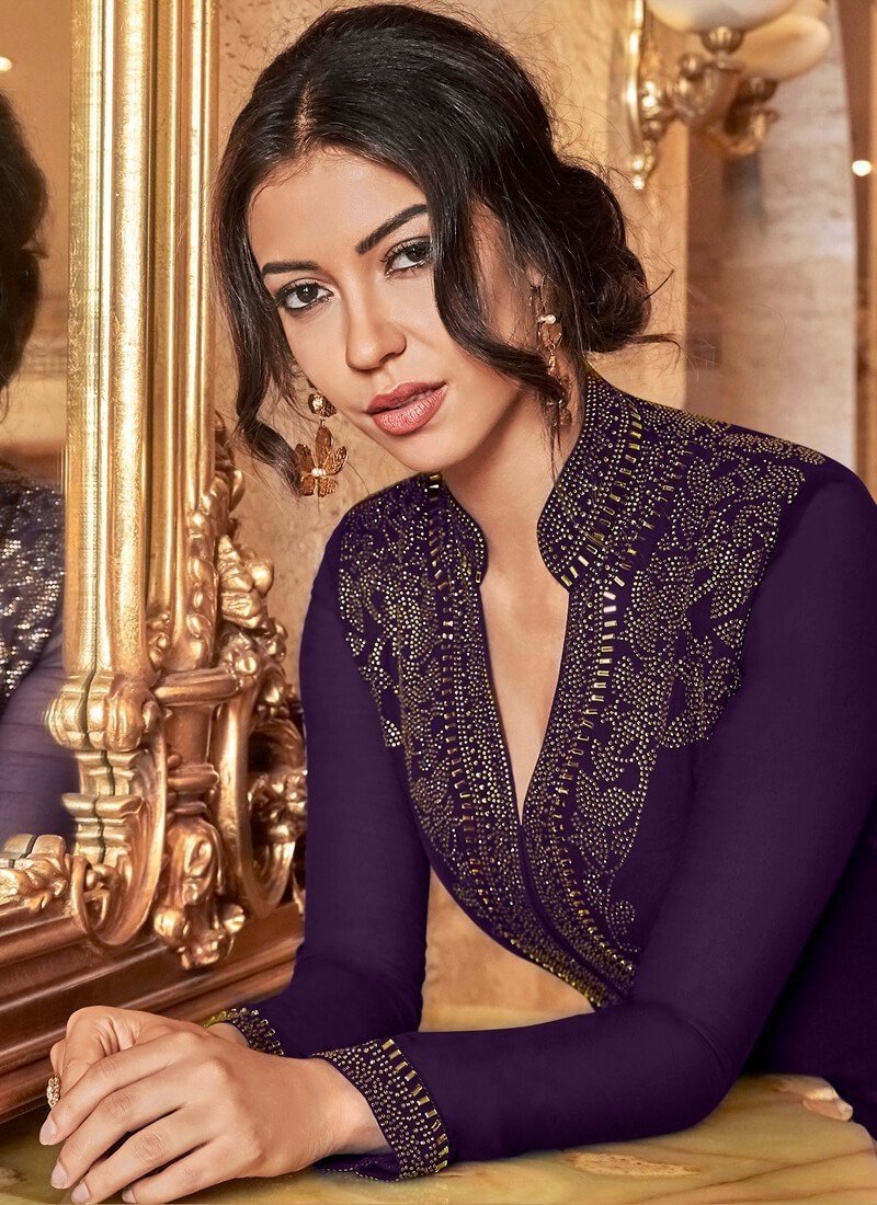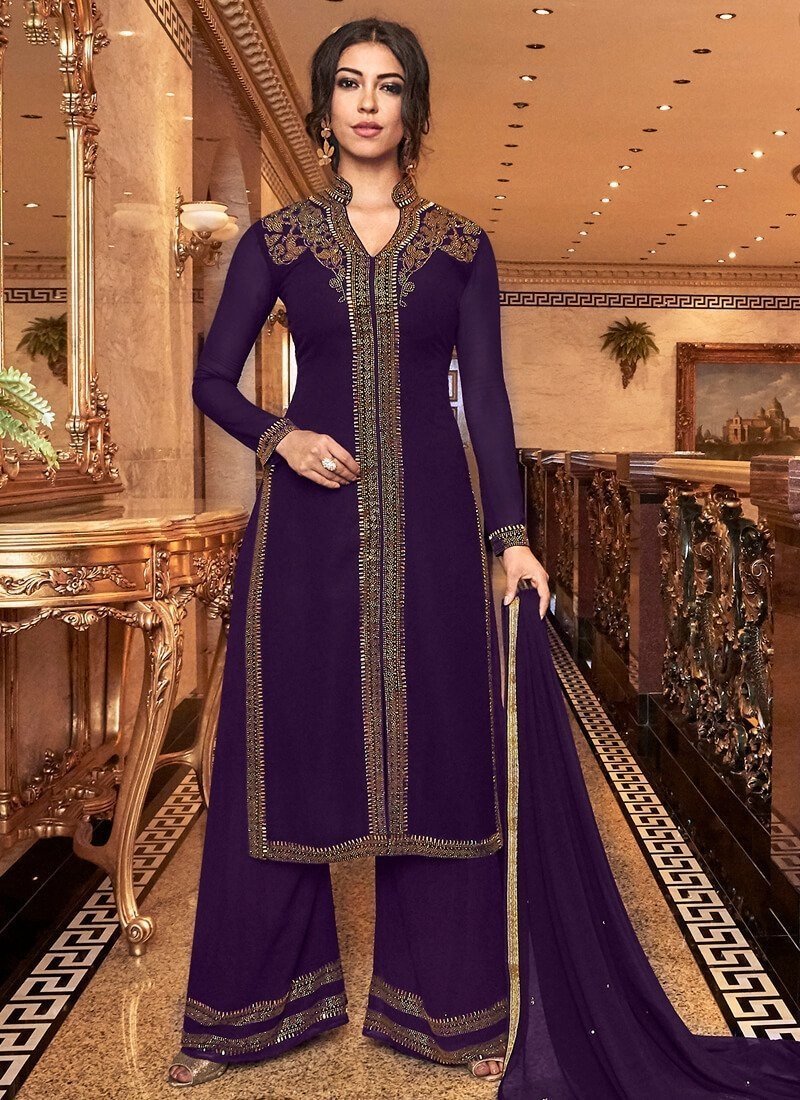 Arabic Muslim Dark Purple colored Salwar Kameez in Pant Style made with Georgette top and Georgette Bottom fabric
