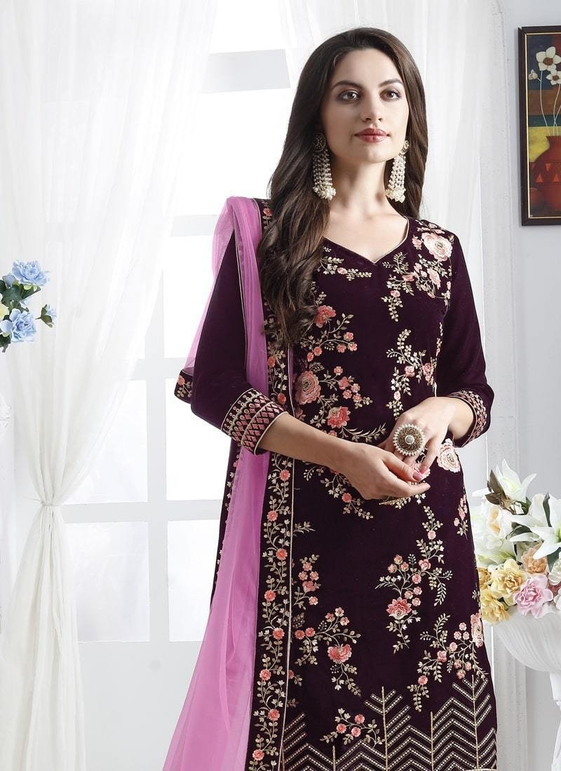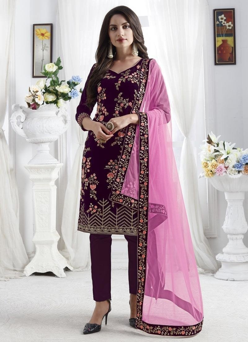 Plus Size Dark Purple colored Salwar Kameez in Pant Style made with Premium 9000 Velvet top and Santoon Bottom fabric