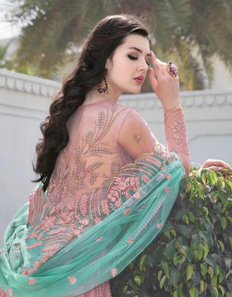 Wedding Suit Dusty Pink Colored Heavy Buterfly Net Top With Dusty Pink Colored Santoon With Butta Patch Work Bottom.