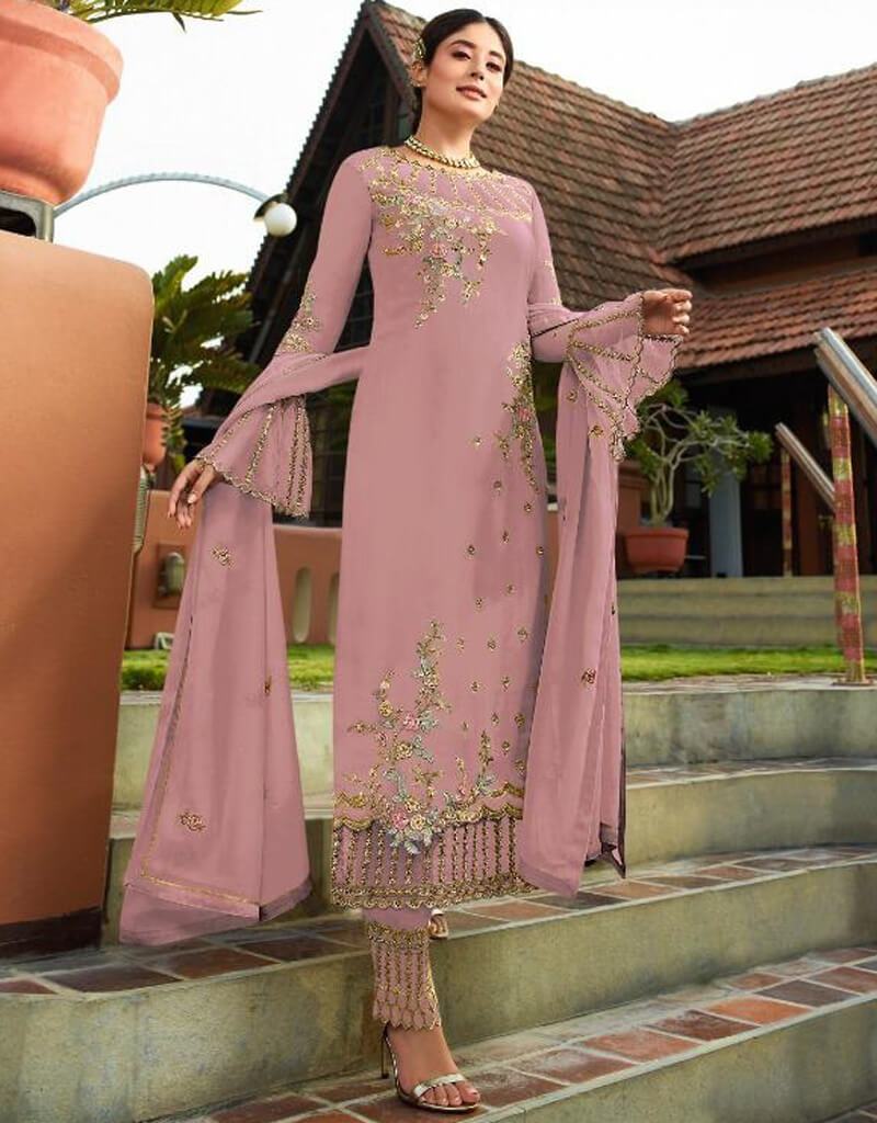 Designer Straight Dusty Pink Colored Heavy Faux Georgette Top With Dusty Pink Colored Heavy Santoon With Embroidery Work Bottom.