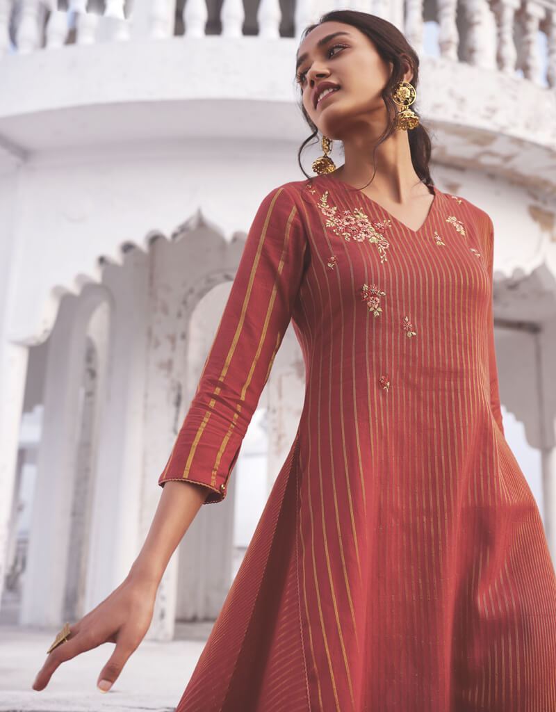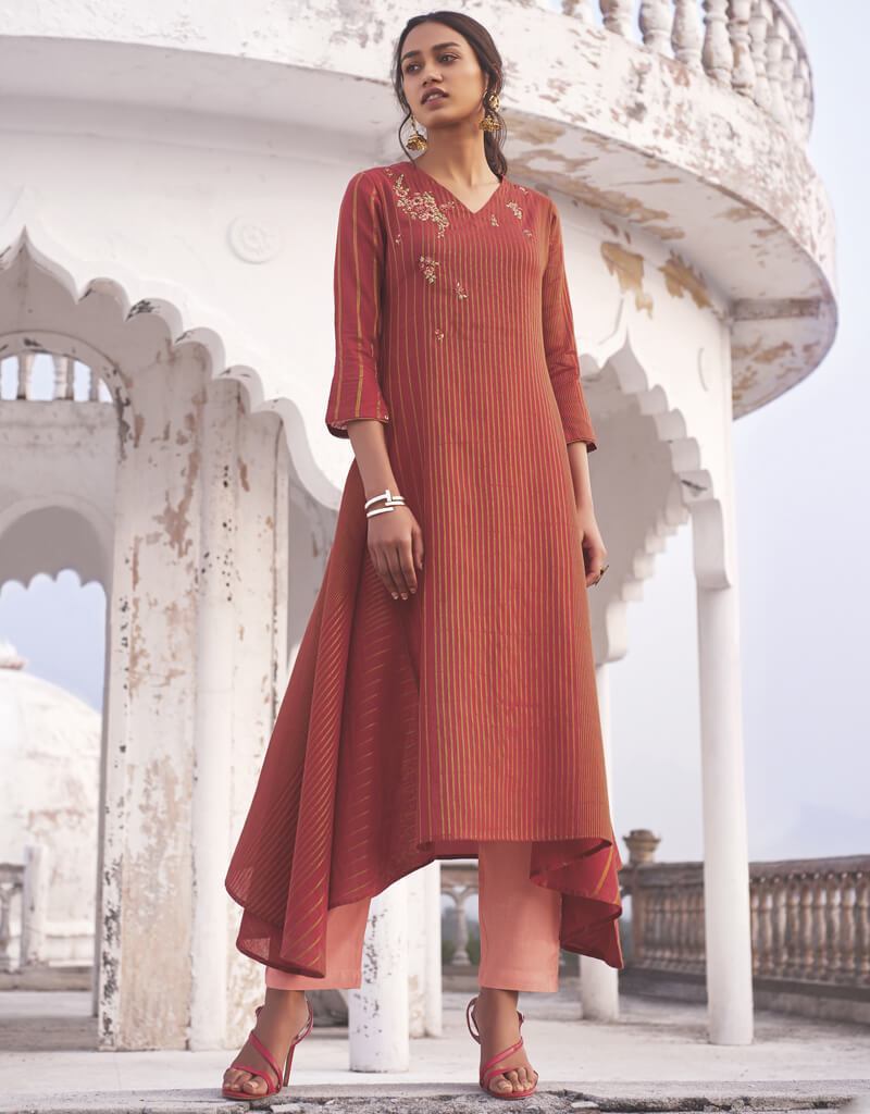 Casual Dress Dusty Red Colored Linen Cotton Handloom Top With Light Pink Colored Rexon Bottom.