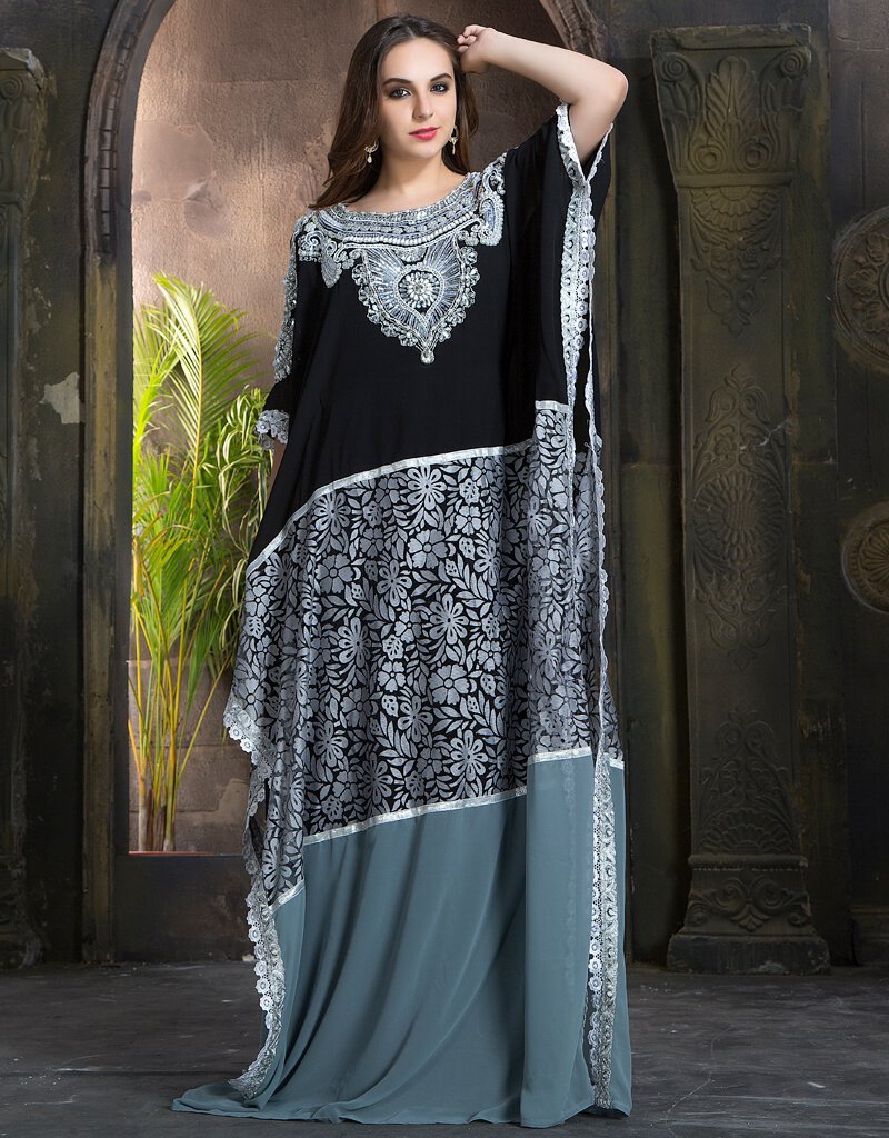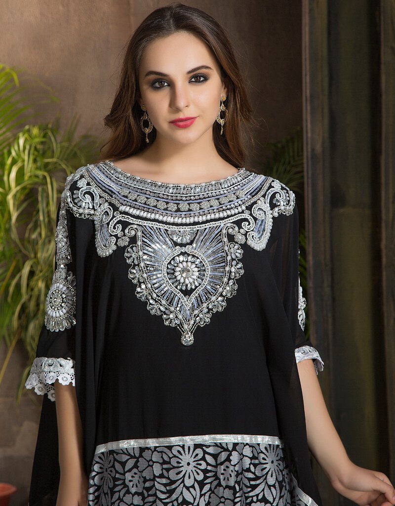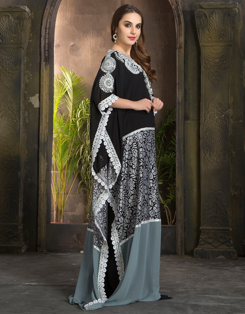 - Fashionable Farasha Style Kaftan Black Color in Georgette Fabric with Silver Establishment