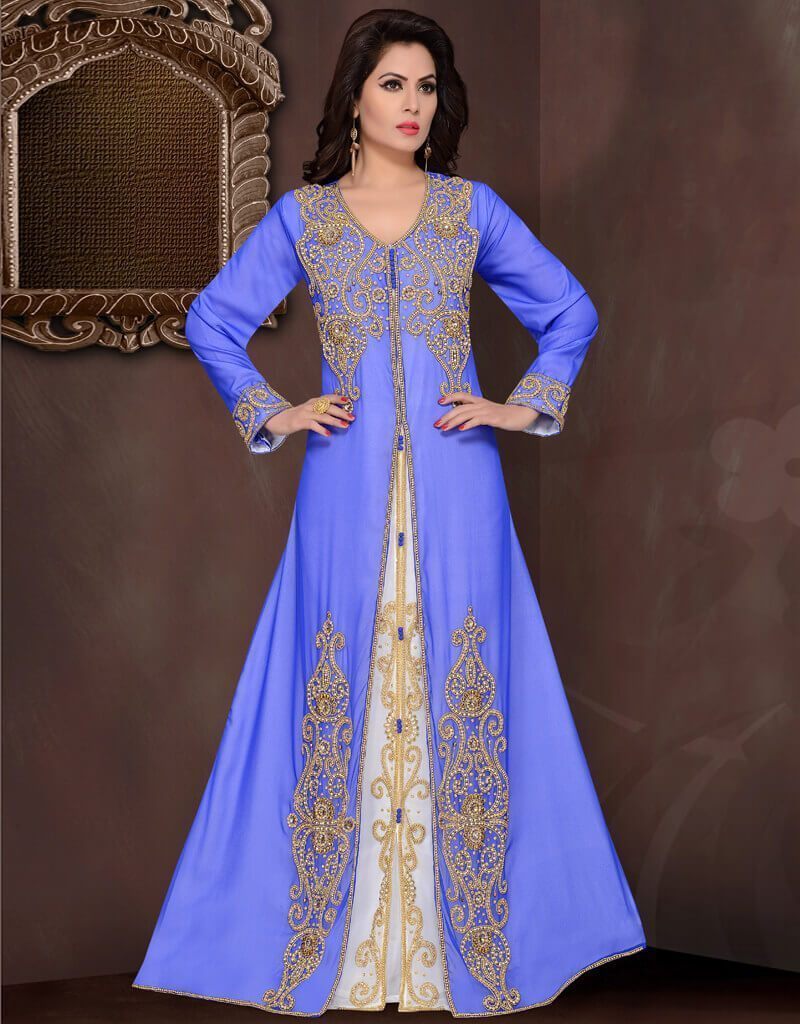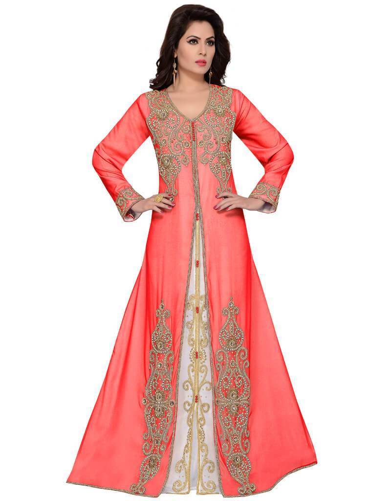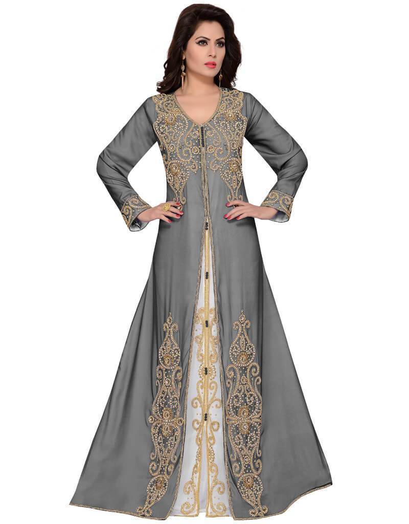 - Muslim Gold embroidered A-line kaftan dress for women.