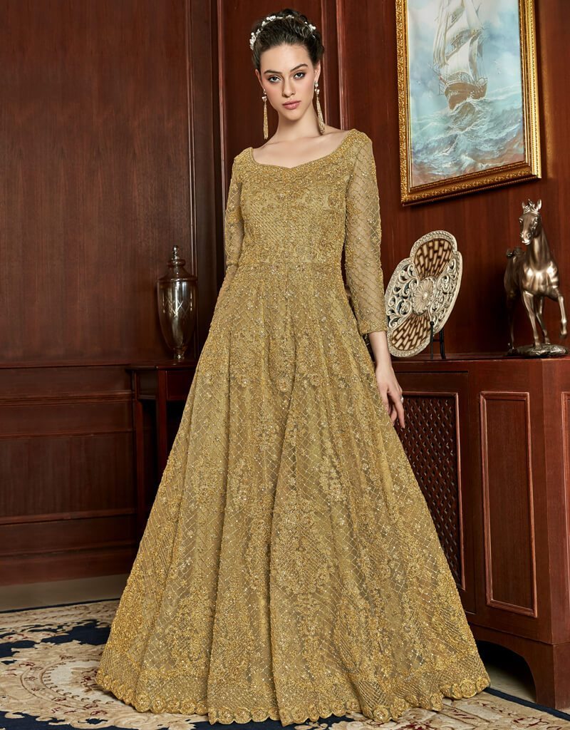 luxury Women Golden colored Salwar Kameez in Anarkali Style made with Net top and Net and Sequins Bottom fabric