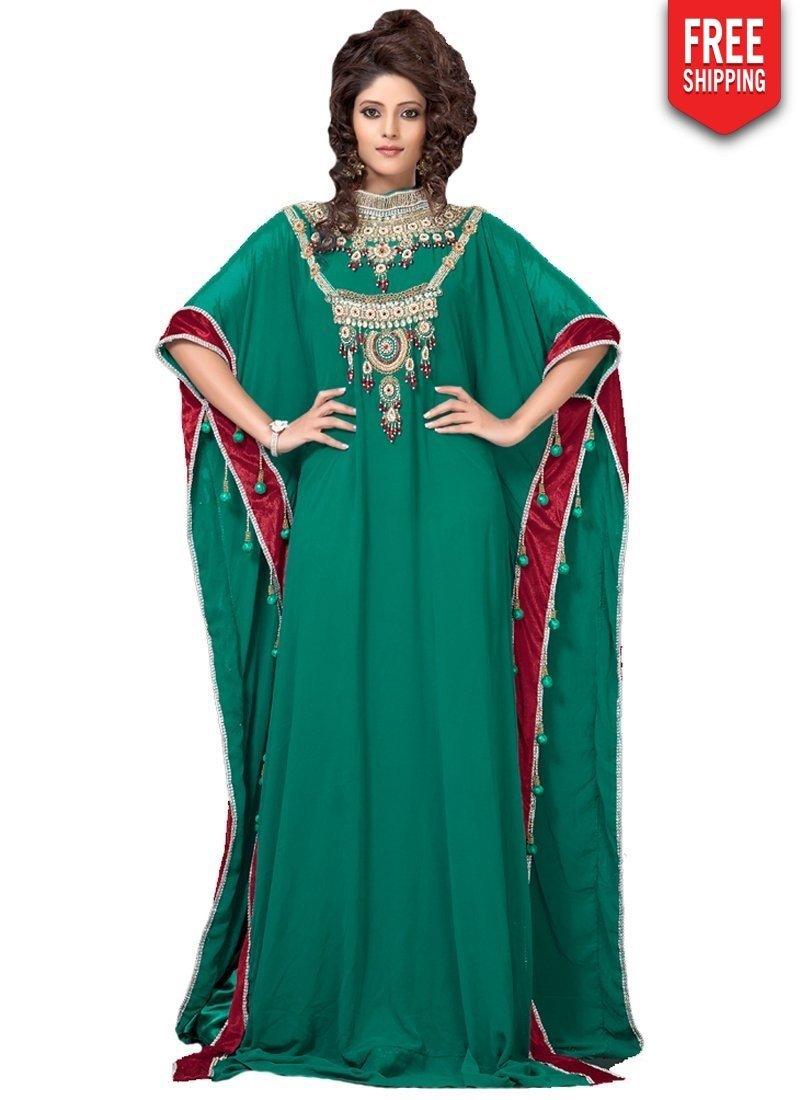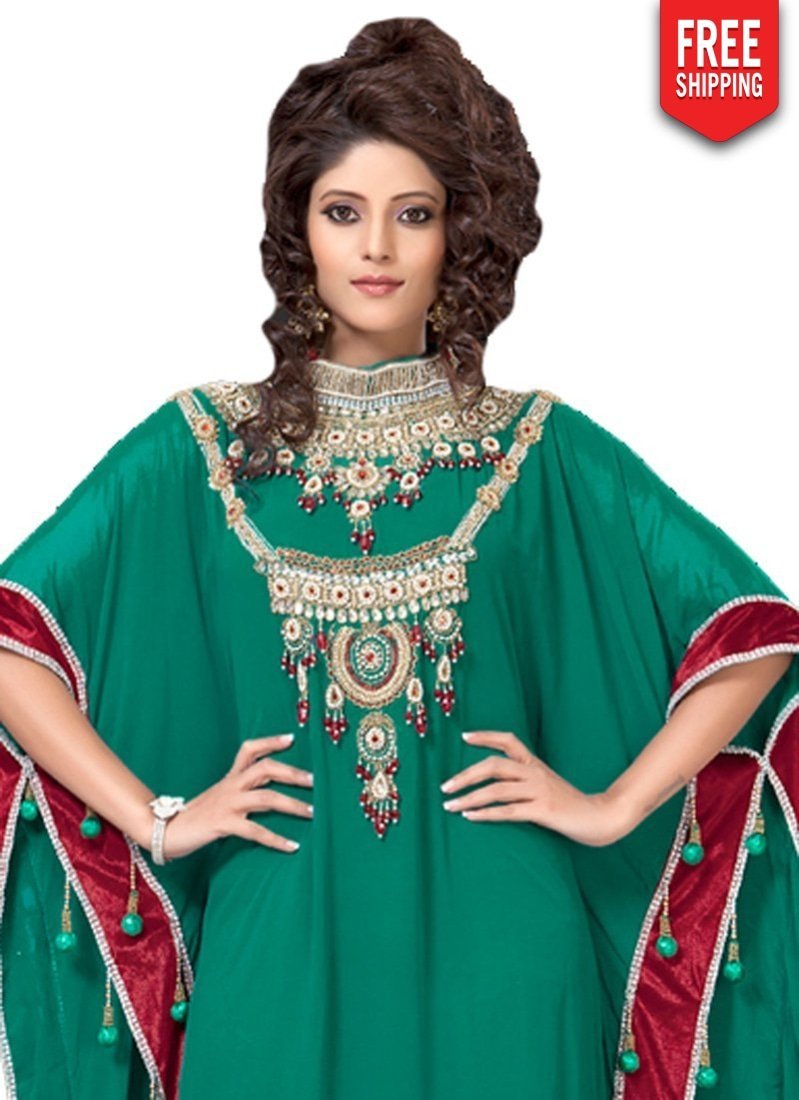 - Necklace style design at neck.Comes with inner waist tie for more flattering fit.100% hand beaded kaftan.Can be made in any size and length.Two side open dress.Plain or Embroidered Hijab (110x150 cm) and Band can be bought separately