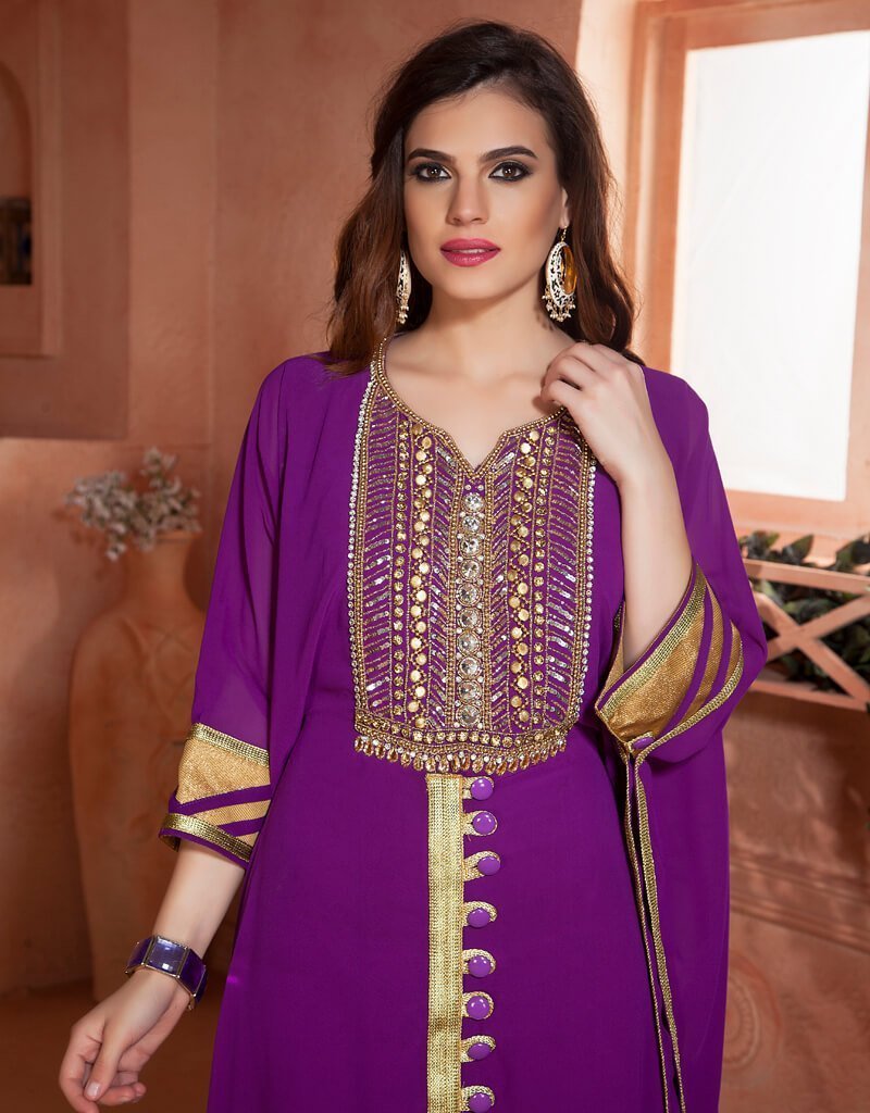 - Hand beaded Muslim Kaftan Purple Color in Georgette Fabric with Golden With Front Slits