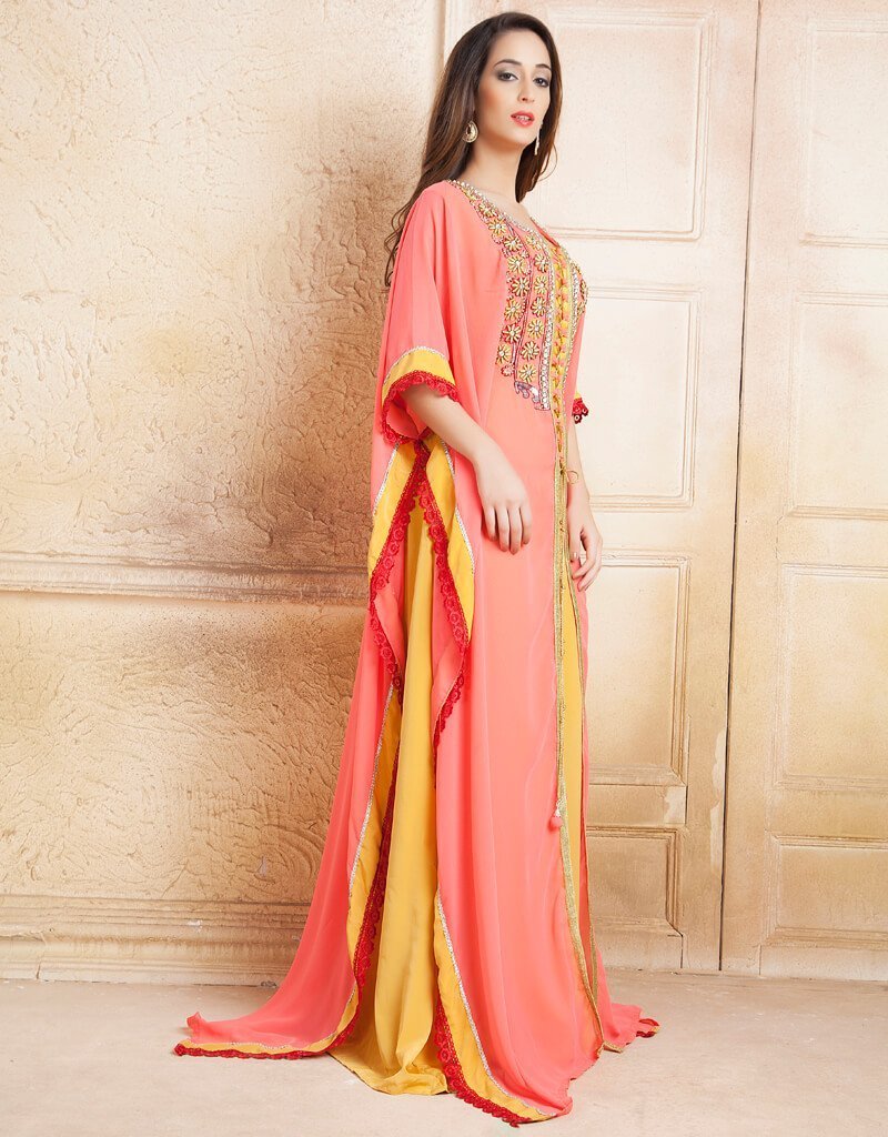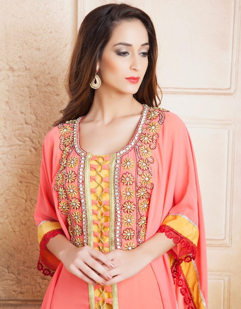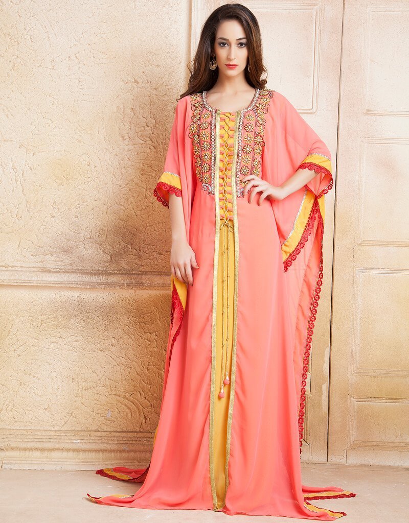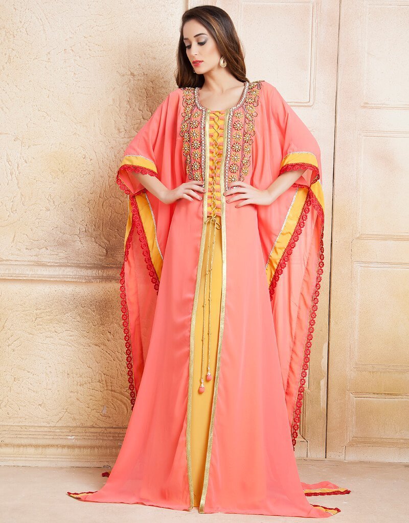 - Handmade Farasha Kaftan Peach Color in Crepe Printed Fabric with Golden Establishment
