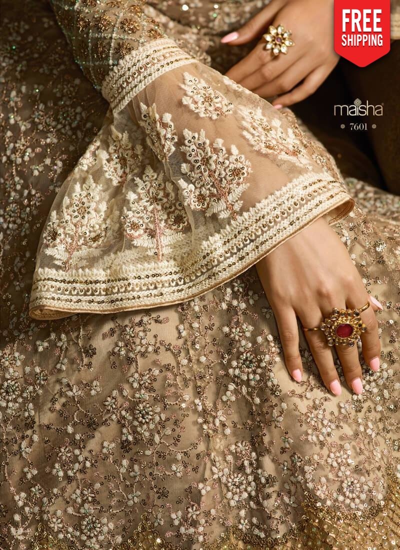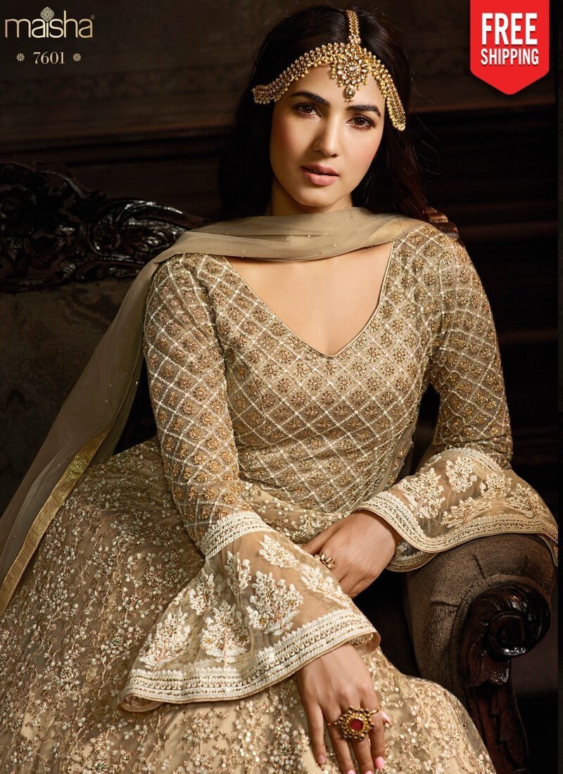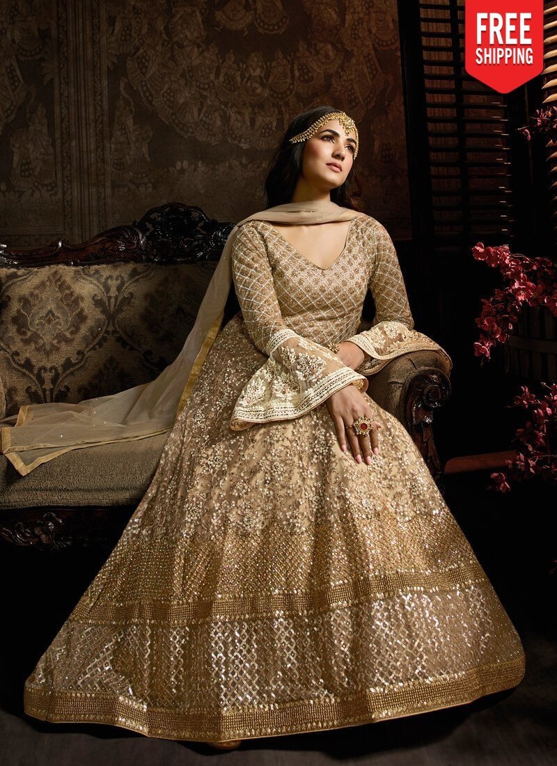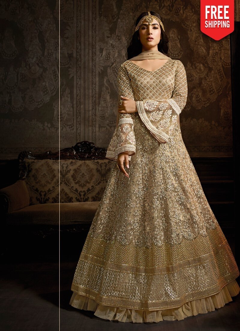 Arabic Muslim Light Brown colored Salwar Kameez in Anarkali Style made with Chiffon top and Santoon Bottom fabric