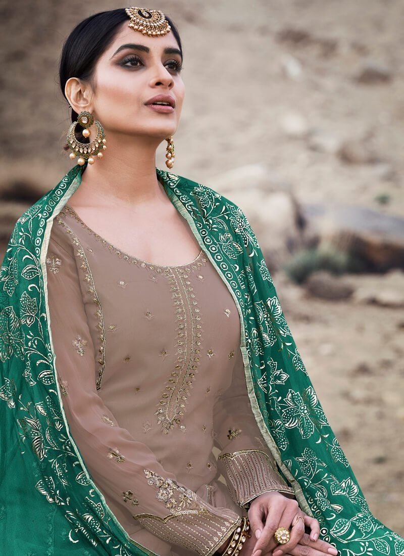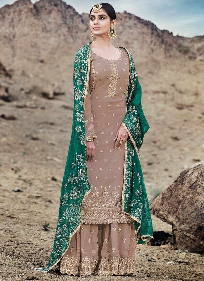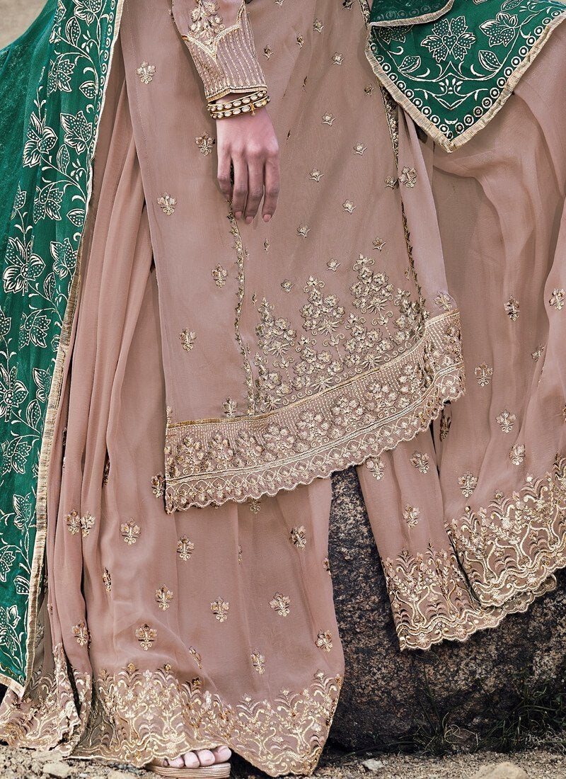 Arabic Muslim Light Brown colored Salwar Kameez in Palazzo Style made with Chiffon Foil Print top and Georgette Bottom fabric