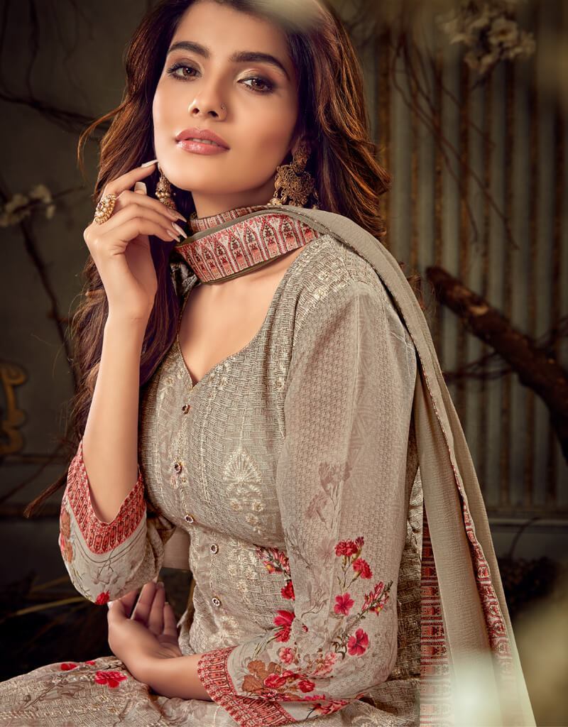 Designer Light Brown colored Salwar Kameez in Palazzo Style made with Pure Viscose Bamberg Georgette top and Santoon Bottom fabric