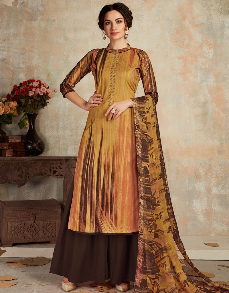 Light Brown Pure Cambric Cotton Digital Style Print With Swarovski Diamond Work Palazzo Straight