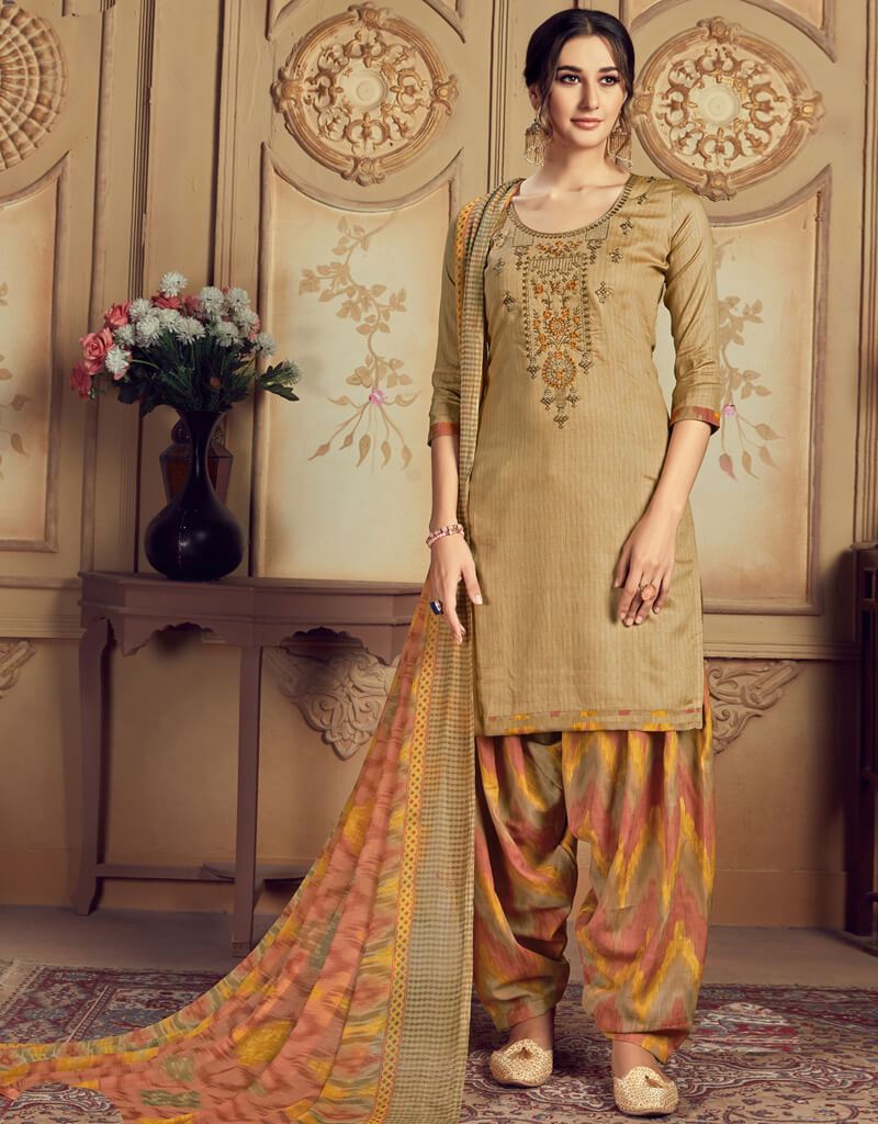 Light Brown Pure Jam Cotton Negative Print With Beautiful Thread Embroidery Patiyala Straight