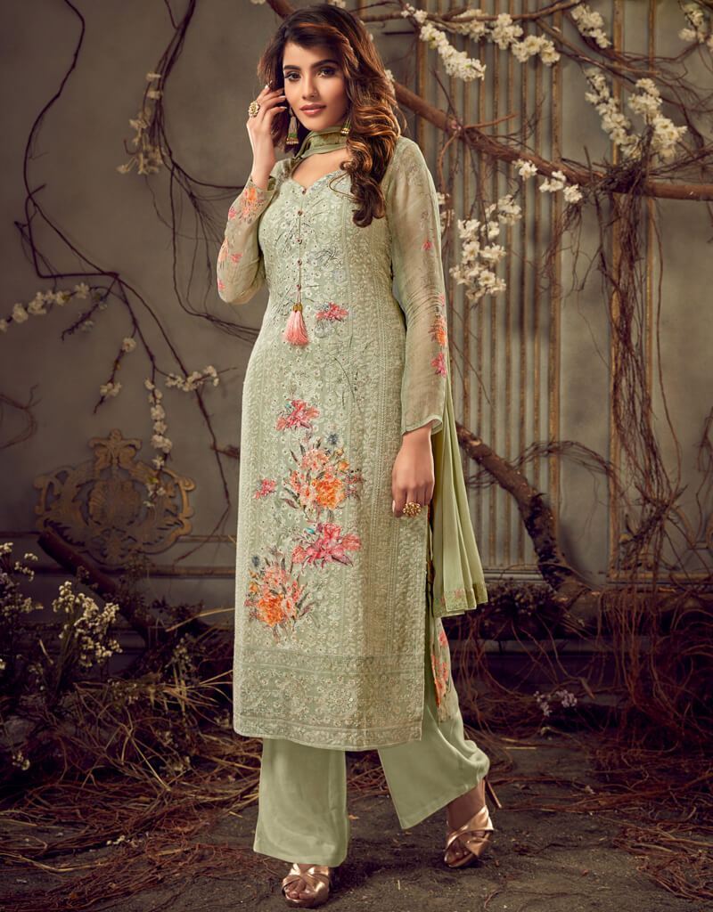 Designer Light Green colored Salwar Kameez in Palazzo Style made with Pure Viscose Bamberg Georgette top and Santoon Bottom fabric
