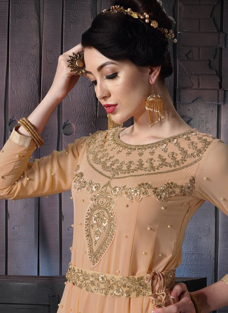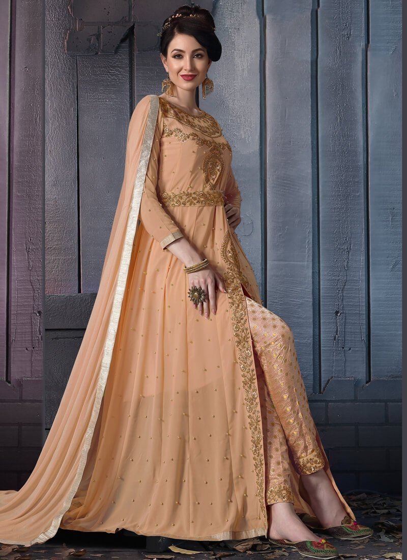 Arabic Muslim Light Orange colored Salwar Kameez in Pant Style made with Pure Chiffon top and Soft Jacquard Bottom fabric