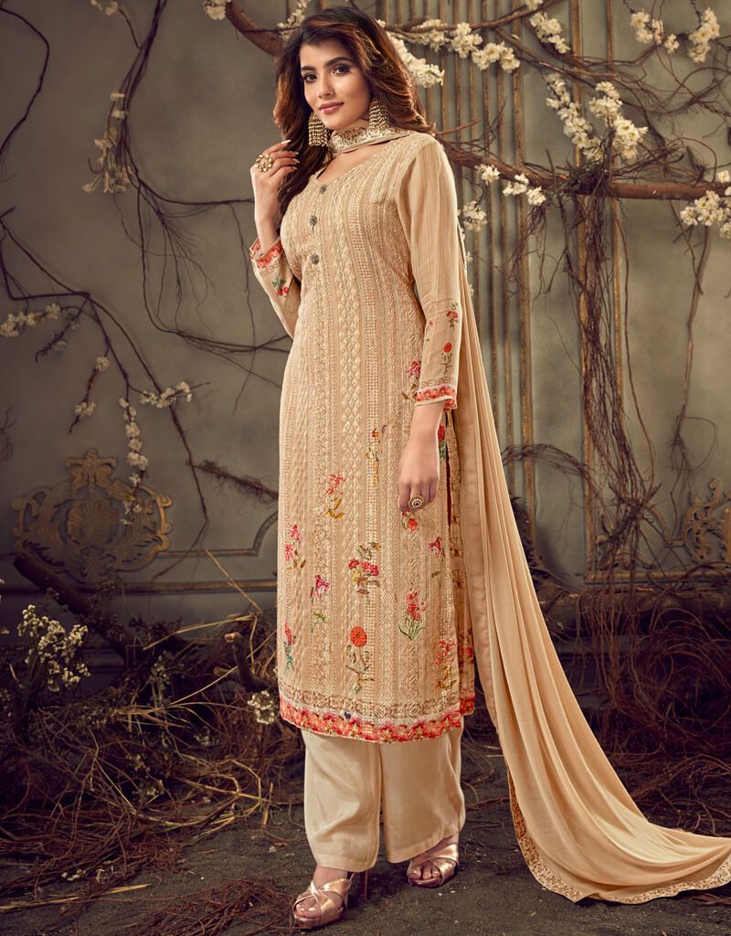 Designer Light Peach colored Salwar Kameez in Pant Style made with Pure Viscose Bamberg Georgette top and Santoon Bottom fabric