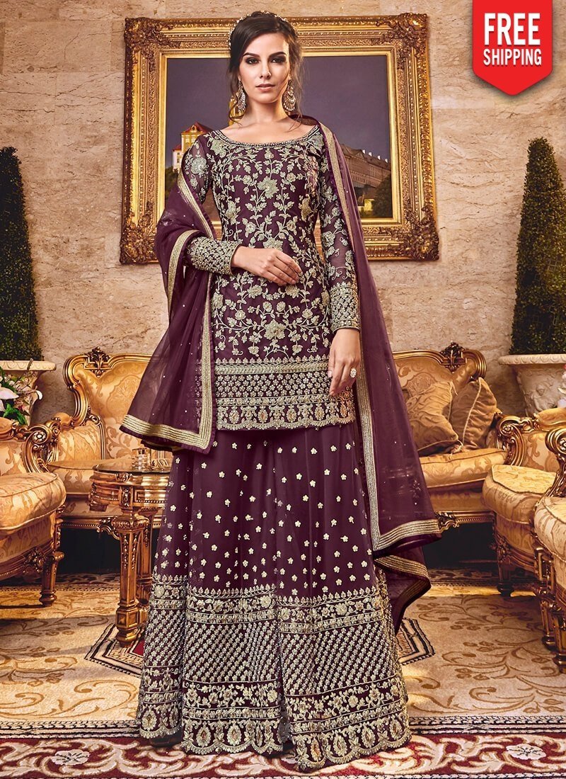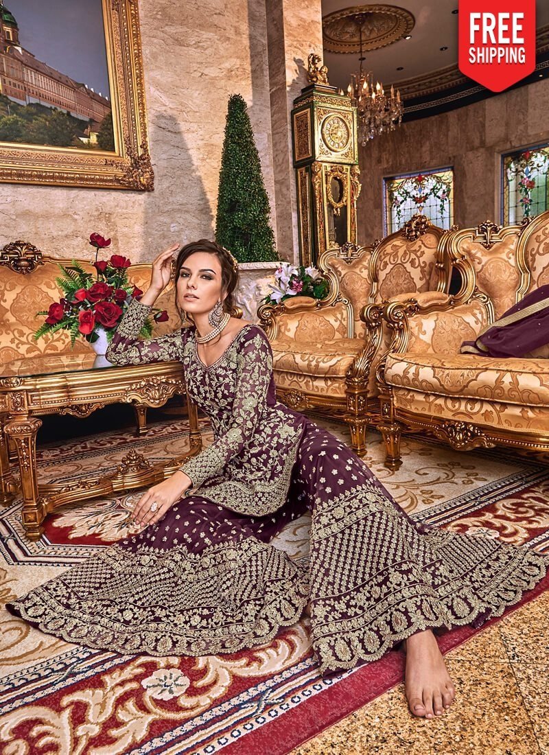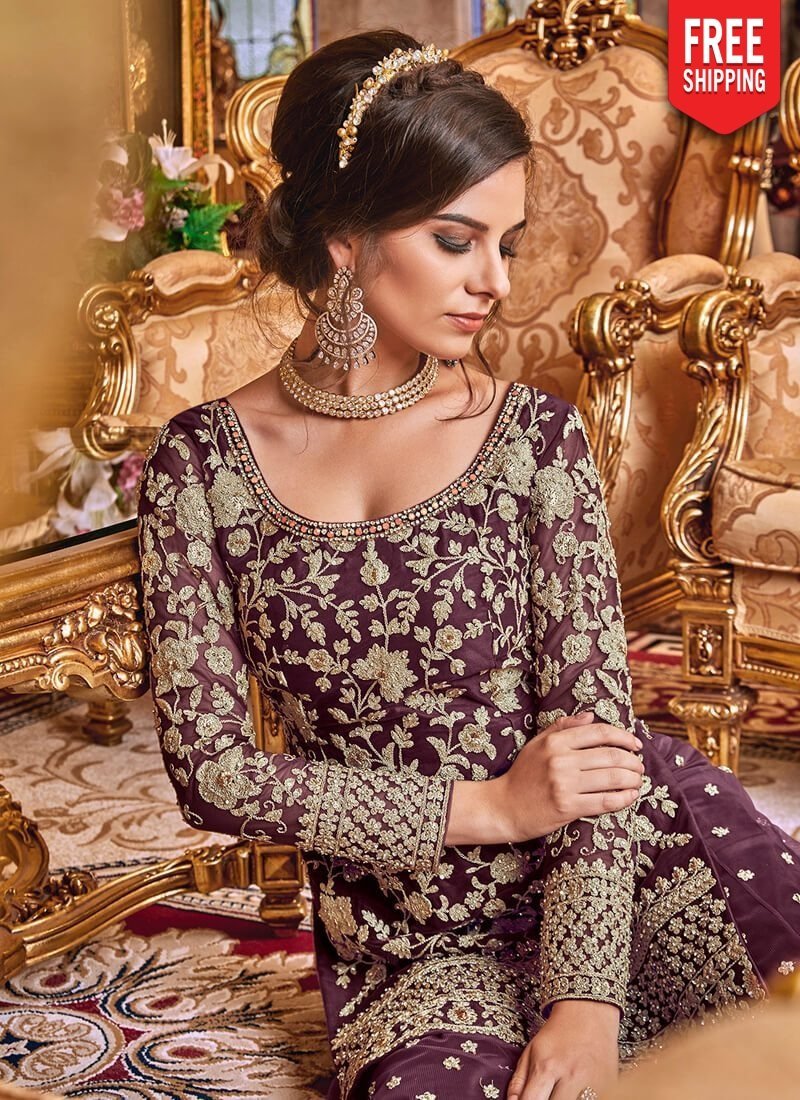 Light Wine Pant style Salwar Kameez Butterfly Net