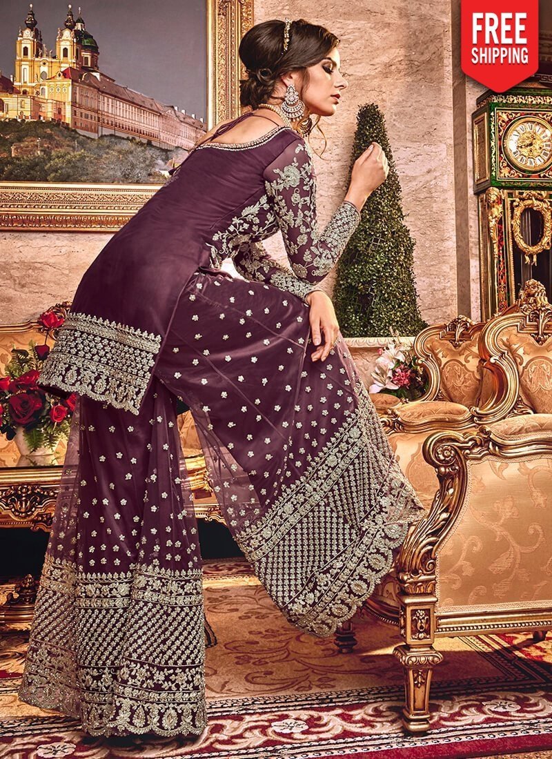 Arabic Muslim Light Wine colored Salwar Kameez in Pant Style made with Butterfly Net top and Butterfly Net Bottom fabric