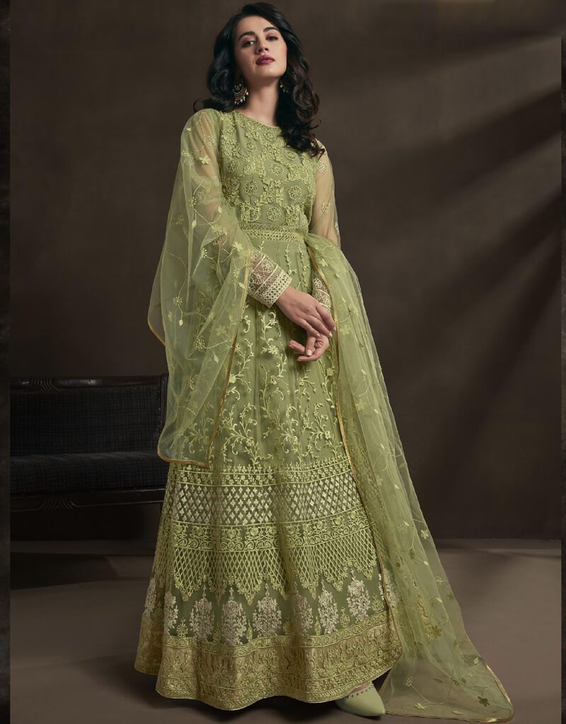 Exclusive Designer Mahendi colored Salwar Kameez in Anarkali Style made with Net top and Net Bottom fabric