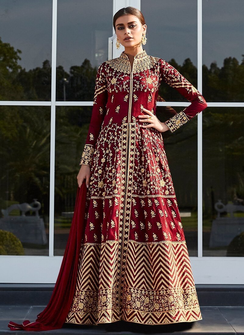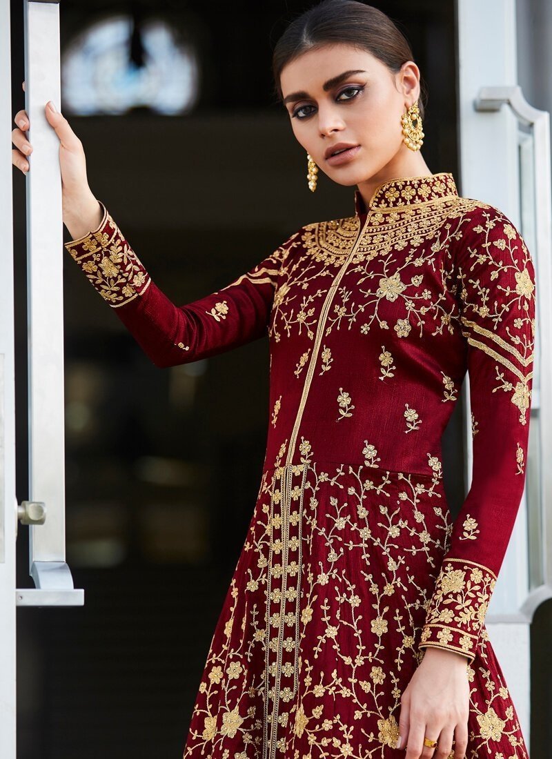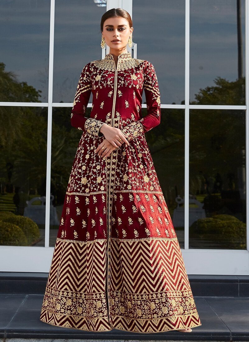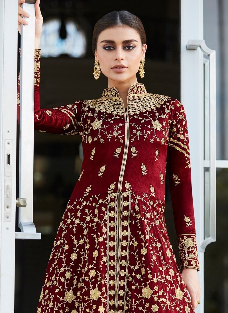 Partywear Maroon colored Salwar Kameez in Anarkali Style made with Nazmine top and Silk Bottom fabric