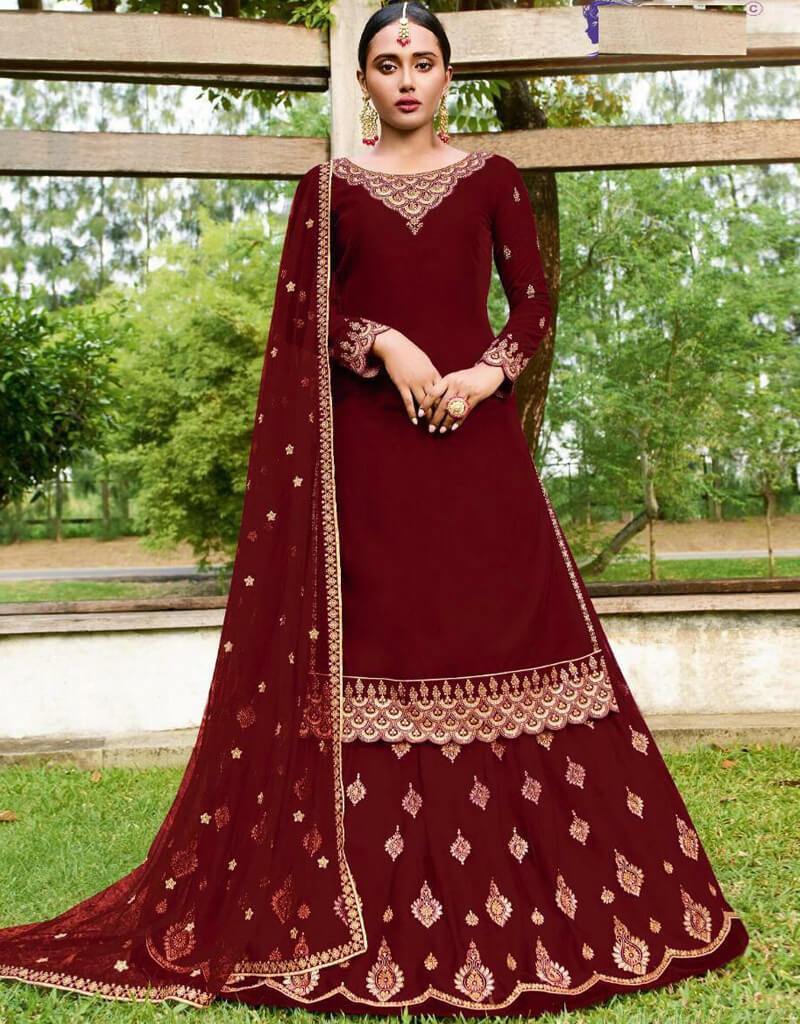 Wedding Straight Maroon Colored Heavy Fux Georgette Top With Maroon Colored Heavy Butterfly Net With Full Embroidery Work Bottom.