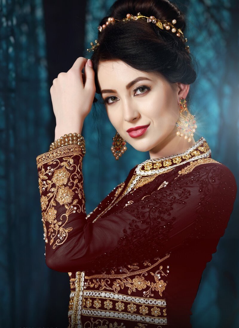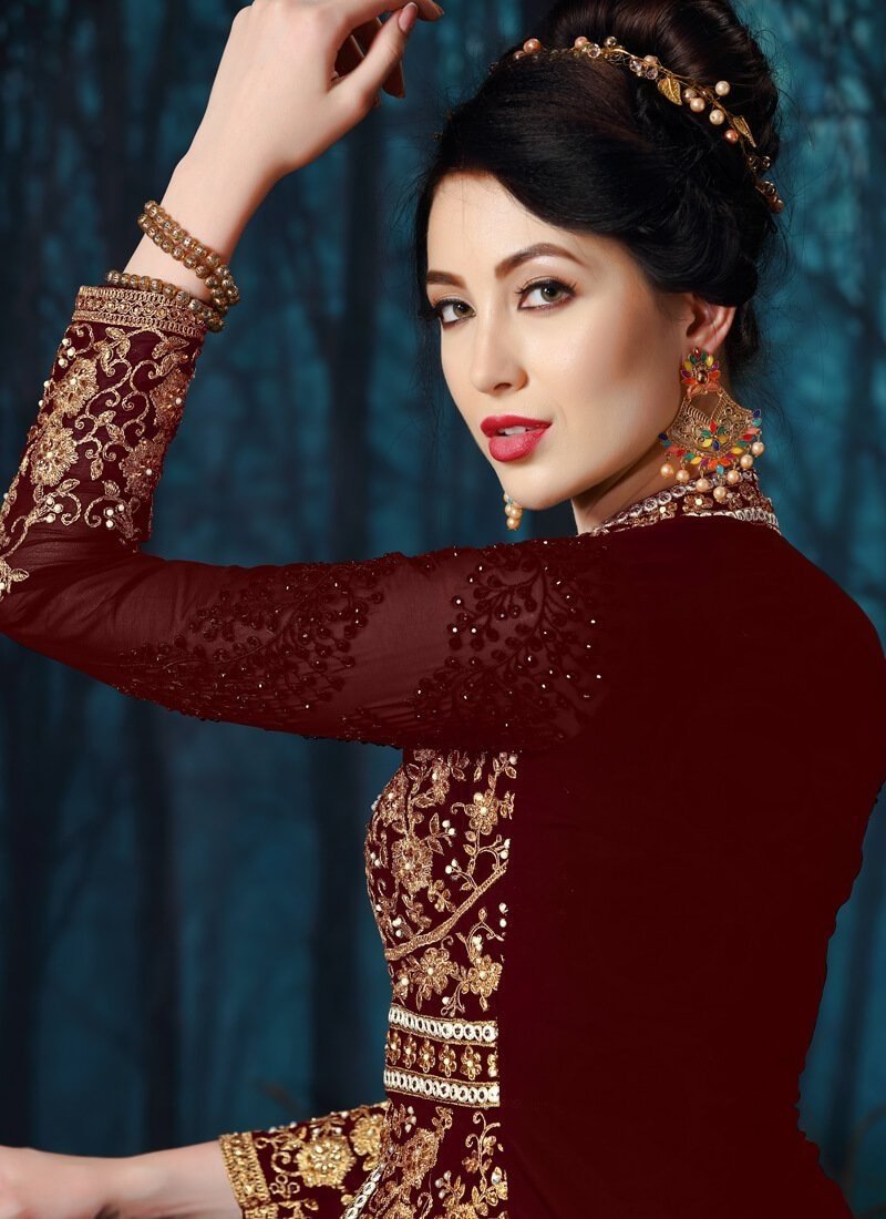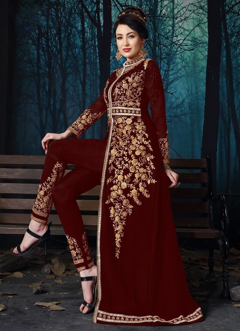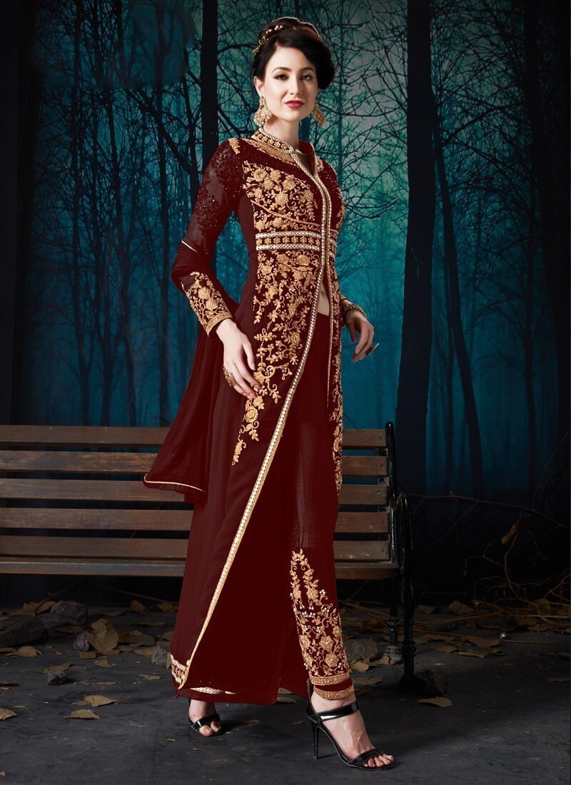 Exclusive designer Maroon colored Salwar Kameez in Pant Style made with Pure Chiffon top and Pure Santoon Bottom fabric