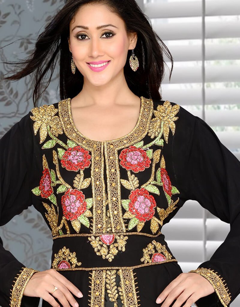 - Give In To The Exotic Confluence Of Today & Tomorrow In This Beautiful Attire Outstanding Craftmanship Of Embellishments Exhibited In This Extraordinary Black Morocan Style Kaftan.This Beautiful Attire Is Showing With Amazing Embroidery & Hand Beaded Work.