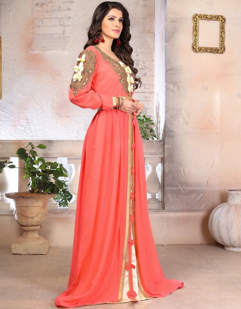 - Moroccan Style Clothing Color in Georgette Printed Fabric with Golden Embroidered Color Establishment