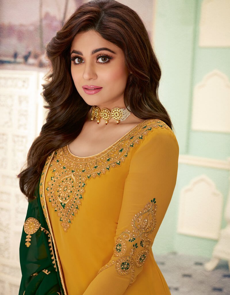 Partywear Mustard colored Salwar Kameez in Lehenga Style made with Real Georgette top and Real Georgette Bottom fabric